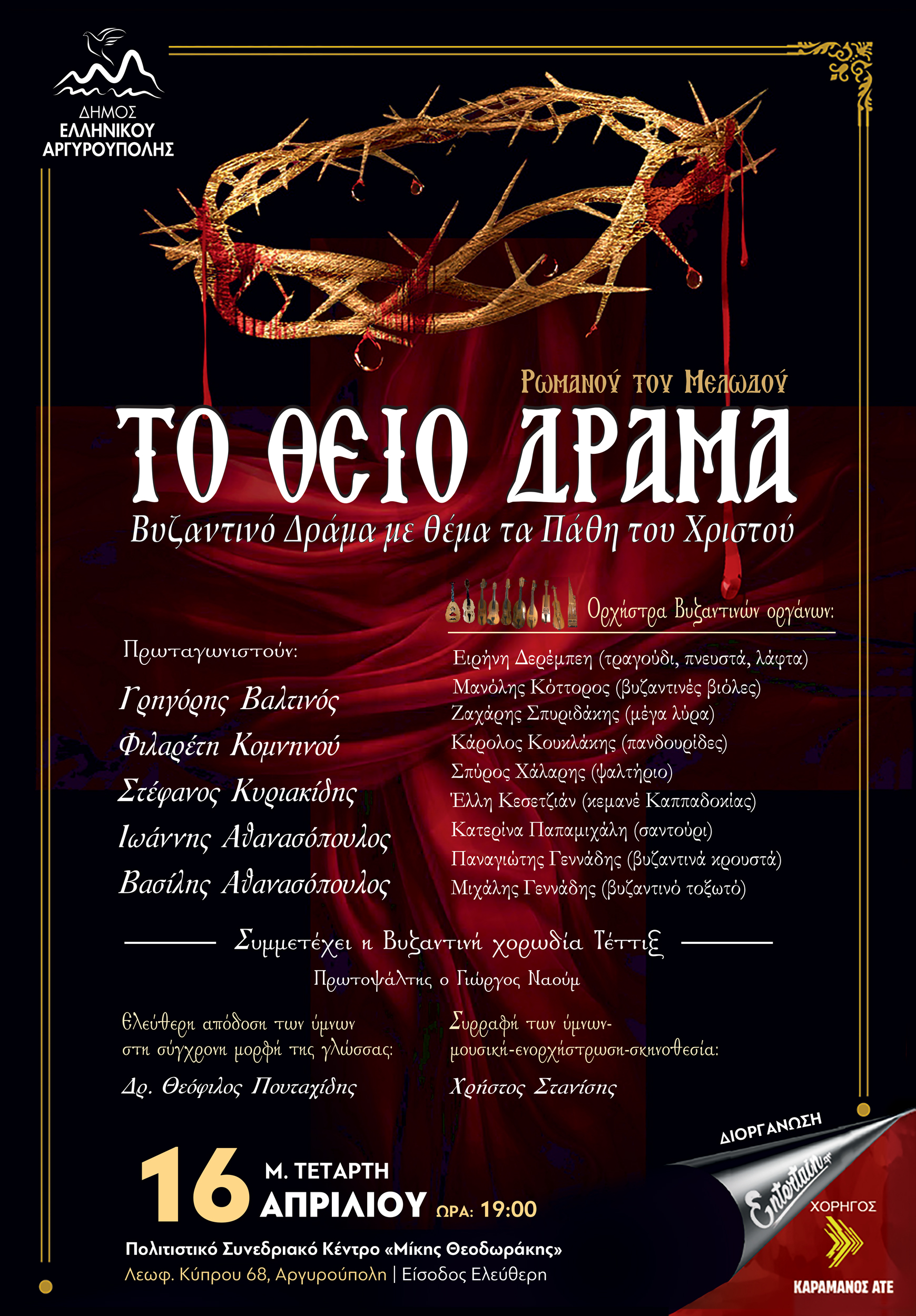 Ο Δήμος Ελληνικού Αργυρούπολης καλεί όλους τους πολίτες στη μοναδική παράσταση, τη Μεγάλη Τετάρτη, 16 Απριλίου 2025 και ώρα 19:00, στο Πολιτιστικό – Συνεδριακό Κέντρο «Μίκης Θεοδωράκης».