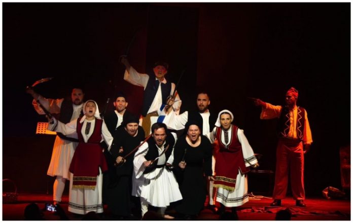 Η εκδήλωση ολοκληρώθηκε με το θεατρικό έργο – δρώμενο «Φλόγα Ελευθερίας – Η Έξοδος» σε κείμενο του Γιώργου Κάλτσα και σκηνοθεσία της Έφης Μεράβογλου. Το κοινό, μέσα από τη θεατρική παράσταση, είχε την ευκαιρία να παρακολουθήσει την αναπαράσταση της Εξόδου και να μεταφερθεί σε μια από τις πιο ηρωικές στιγμές της ιστορίας. Δέκα ηθοποιοί παρουσίασαν μέσω των ρόλων τους τις τελευταίες στιγμές των πολιορκημένων και αναπαράστησαν την Έξοδο του Μεσολογγίου με τρόπο εξαιρετικά συγκινητικό και ρεαλιστικό. Οι θεατές είδαν, πως “έπεσαν” οι ήρωες του Μεσολογγίου και κατανόησαν την αγωνία και τα συναισθήματα τους.