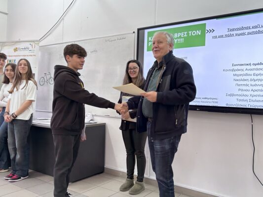 Παρουσία μαθητών, εκπαιδευτικών και Δημάρχου έγινε μια εποικοδομητική κουβέντα με βάση την πρόταση δημιουργίας ποδηλατοδρόμου, για την μετακίνηση των μαθητών στα σχολεία, αλλά και στην άμεση φροντίδα των πεζοδρομίων για την ασφαλή μετακίνηση των πολιτών με δυσκολία στην όραση. Δυναμική η συμμετοχή τους στην πανελλήνια δράση των εφήβων μέσω του σχολικού περιβάλλοντος.