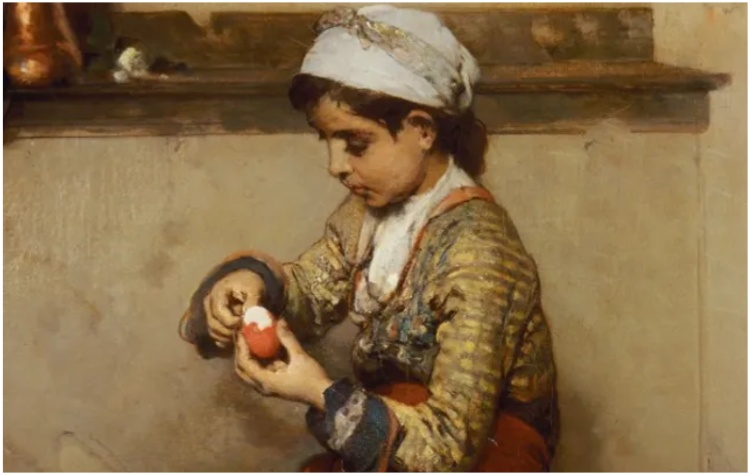 2. Ο Νικηφόρος Λύτρας, ζωγράφισε έναν υπέροχο πίνακα, που έχει ένα κόκκινο αυγό στο κέντρο και έχει τίτλο «Το ωόν του Πάσχα» (φωτό). Μας δείχνει ένα αβγουλάκι που το ξεφλουδίζει με προσοχή το νεαρό κορίτσι του πίνακα. Λίγα πεσμένα τσόφλια επάνω στην κατακόκκινη φούστα της μικρής, φανερώνει ότι το ξεφλούδισμα του αβγού είναι σε «εξέλιξη». Ο πίνακας, είναι μια απλή τρυφερή σκηνή, που μας δείχνει την καλλιτεχνική ιδιοφυία του σπουδαίου ζωγράφου, που υπήρξε ένας από τους σημαντικότερους εκπροσώπους της Σχολής του Μονάχου.
