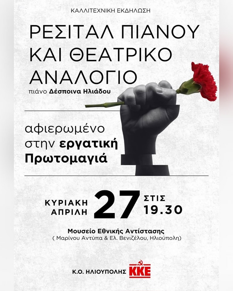 Η εκδήλωση θα περιλαμβάνει ρεσιτάλ πιάνου από τη Δέσποινα Ηλιάδου με έργα των μεγαλύτερων κλασικών συνθετών και θεατρικό αναλόγιο με κείμενα εμπνευσμένα από την Εργατική Πρωτομαγιά.