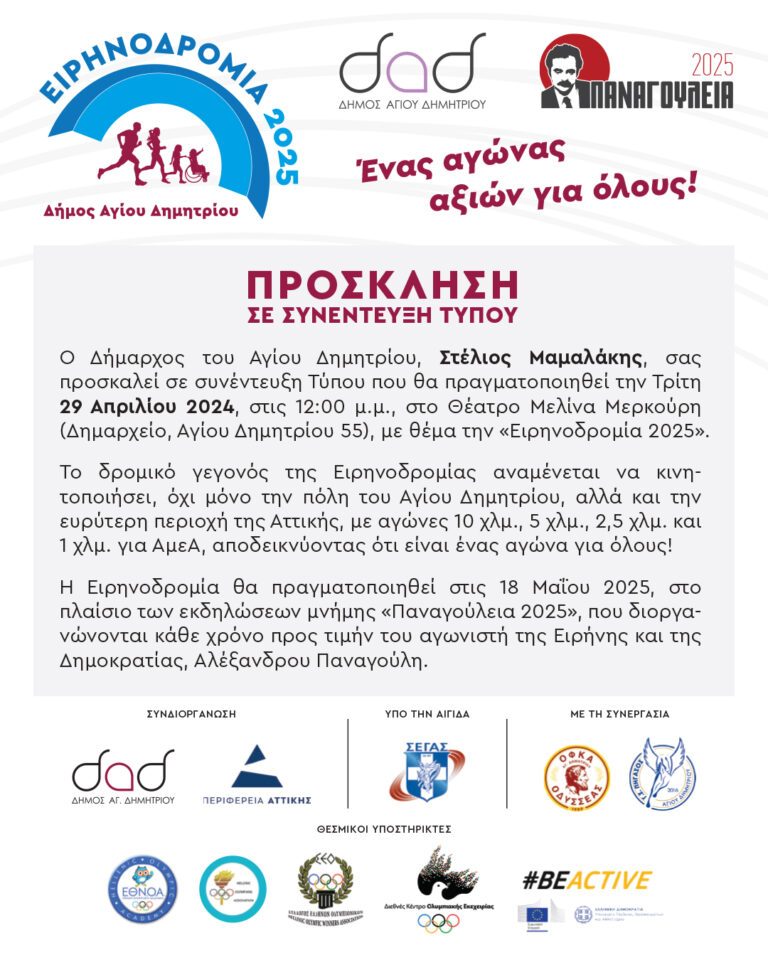 Καθώς οι εγγραφές και οι προετοιμασίες για την «Ειρηνοδρομία 2025» συνεχίζονται με εντατικούς ρυθμούς, ο Δήμος Αγίου Δημητρίου διοργανώνει μία συνέντευξη Τύπου, που θα πραγματοποιηθεί την Τρίτη 29 Απριλίου 2024 και ώρα 12:00 μ.μ., στο Θέατρο Μελίνα Μερκούρη (Δημαρχείο, Αγίου Δημητρίου 55), με θέμα την «Ειρηνοδρομία 2025».