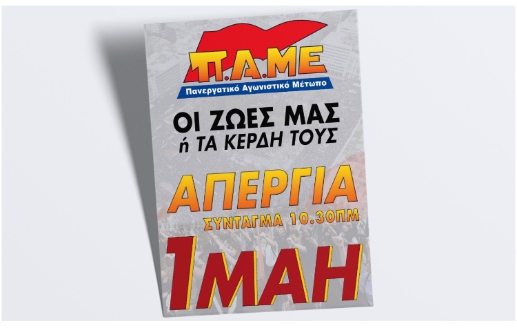Σε μαζική συμμετοχή στην απεργία της 1ης Μάη καλεί το Πανεργατικό Αγωνιστικό Μέτωπο (Π.Α.ΜΕ) για την Εργατική Πρωτομαγιά.