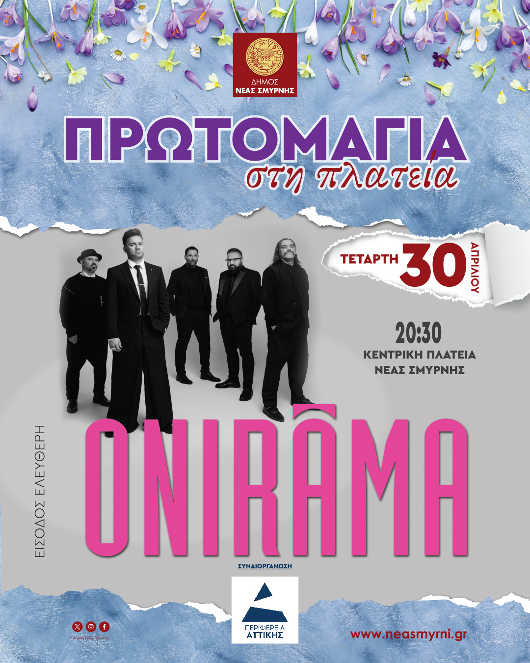 Οι Onirama γεμίζουν τις αποσκευές τους με τις μεγαλύτερες επιτυχίες τους, τα πιο αγαπημένα τραγούδια τους και την καλύτερή τους διάθεση κι έρχονται στην Κεντρική Πλατεία Νέας Σμύρνης, την Τετάρτη 30 Απριλίου στο πλαίσιο των Πρωτομαγιάτικων εκδηλώσεων του Δήμου.