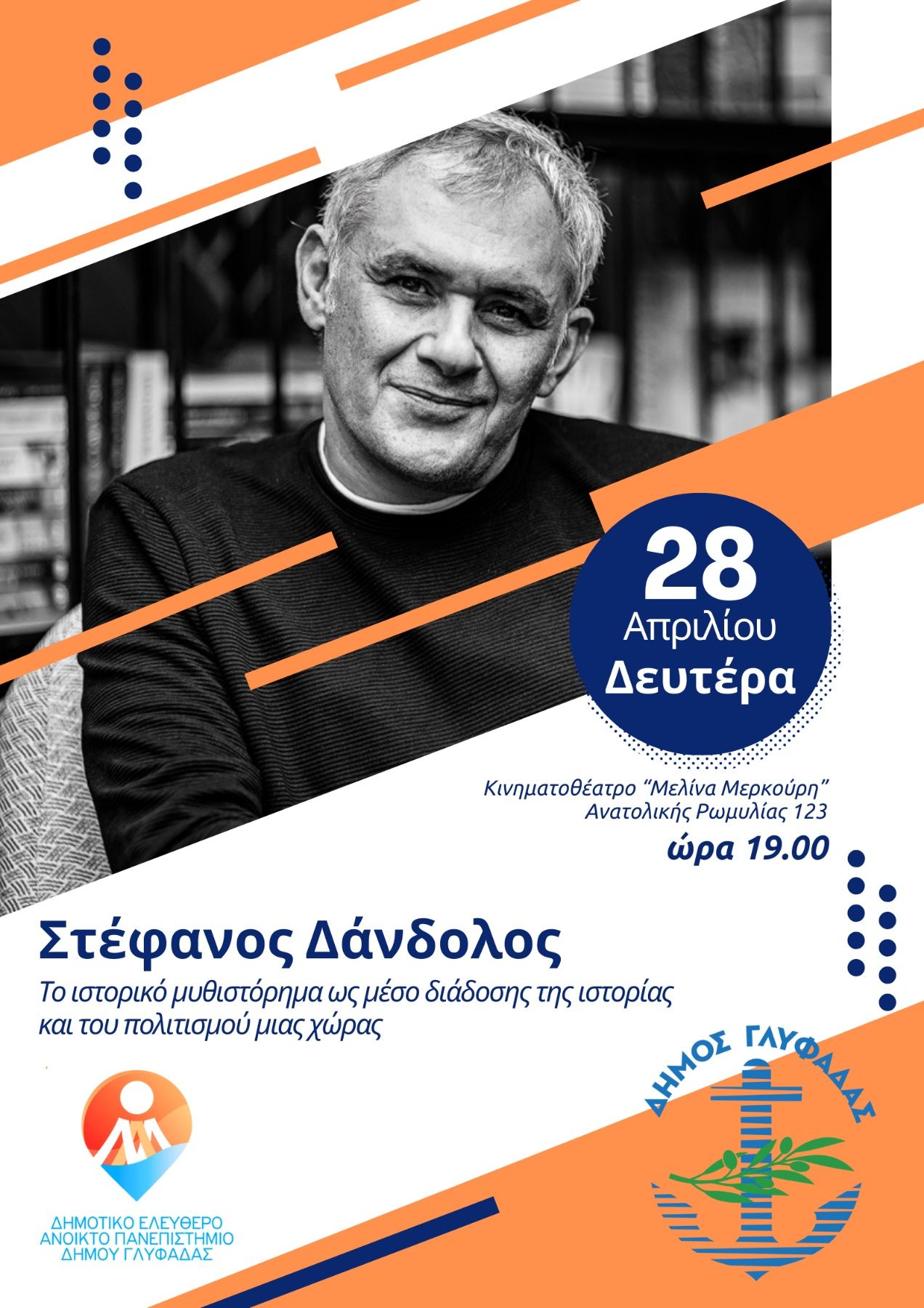 Ο Γλυφαδιώτης συγγραφέας των μεγάλων επιτυχιών Στέφανος Δάνδολος έρχεται την προσεχή Δευτέρα, 28 Απριλίου και ώρα 19.00, στο Δημοτικό Ελεύθερο Ανοικτό Πανεπιστήμιο (ΔΕΑΠ) Γλυφάδας για μια πολύ ενδιαφέρουσα συζήτηση με θέμα: «Το ιστορικό μυθιστόρημα ως μέσο διάδοσης της ιστορίας και του πολιτισμού μιας χώρας».