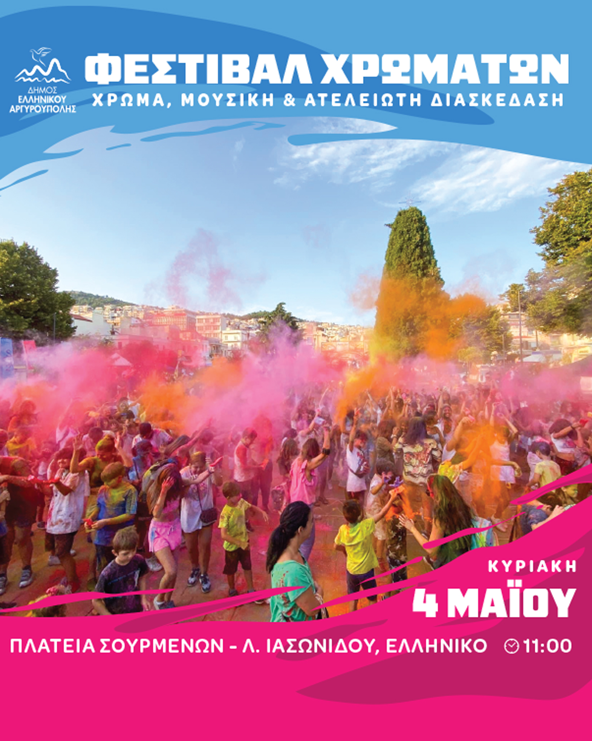 Την Κυριακή 4 Μαΐου στις 11:00 το πρωί, το Ελληνικό θα γεμίσει χρώματα και χαμόγελα, με το Μοναδικό Φεστιβάλ Χρωμάτων που θα λάβει χώρο στον Δήμο Ελληνικού Αργυρούπολης.