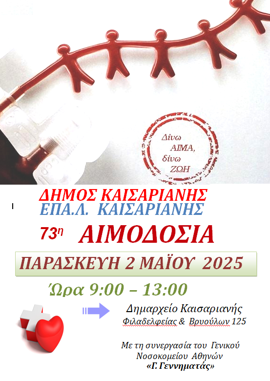 Την 73η Εθελοντική Αιμοδοσία διοργανώνει ο Δήμος και το ΕΠΑ.Λ Καισαριανής, με τη συνεργασία του Γενικού Νοσοκομείου Αθηνών «Γ. Γεννηματάς».