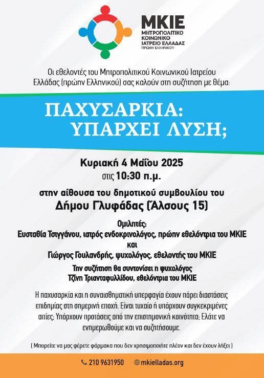 Οι εθελοντές του Μητροπολιτικού Κοινωνικού Ιατρείου Ελλάδας (πρώην Ελληνικού) διοργανώνουν μια ενδιαφέρουσα και εξαιρετικά σημαντική εκδήλωση, στην αίθουσα Δημοτικού Συμβουλίου του Δημαρχείου Γλυφάδας (στο ισόγειο του Δημαρχιακού Μεγάρου – Άλσους 15, Γλυφάδα 166 75) την προσεχή Κυριακή 4 Μάϊου, στις 10:30 το πρωί.