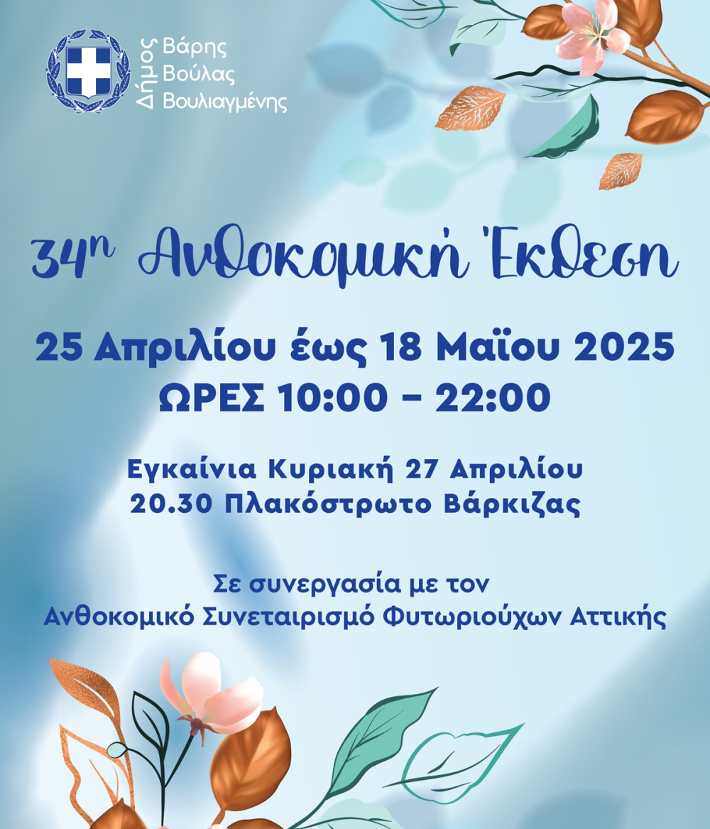 Ο Δήμος Βάρης Βούλας Βουλιαγμένης διοργανώνει την 34η Ανθοκομική Έκθεση, σε συνεργασία με τον Ανθοκομικό Συνεταιρισμό Φυτωριούχων Αττικής.