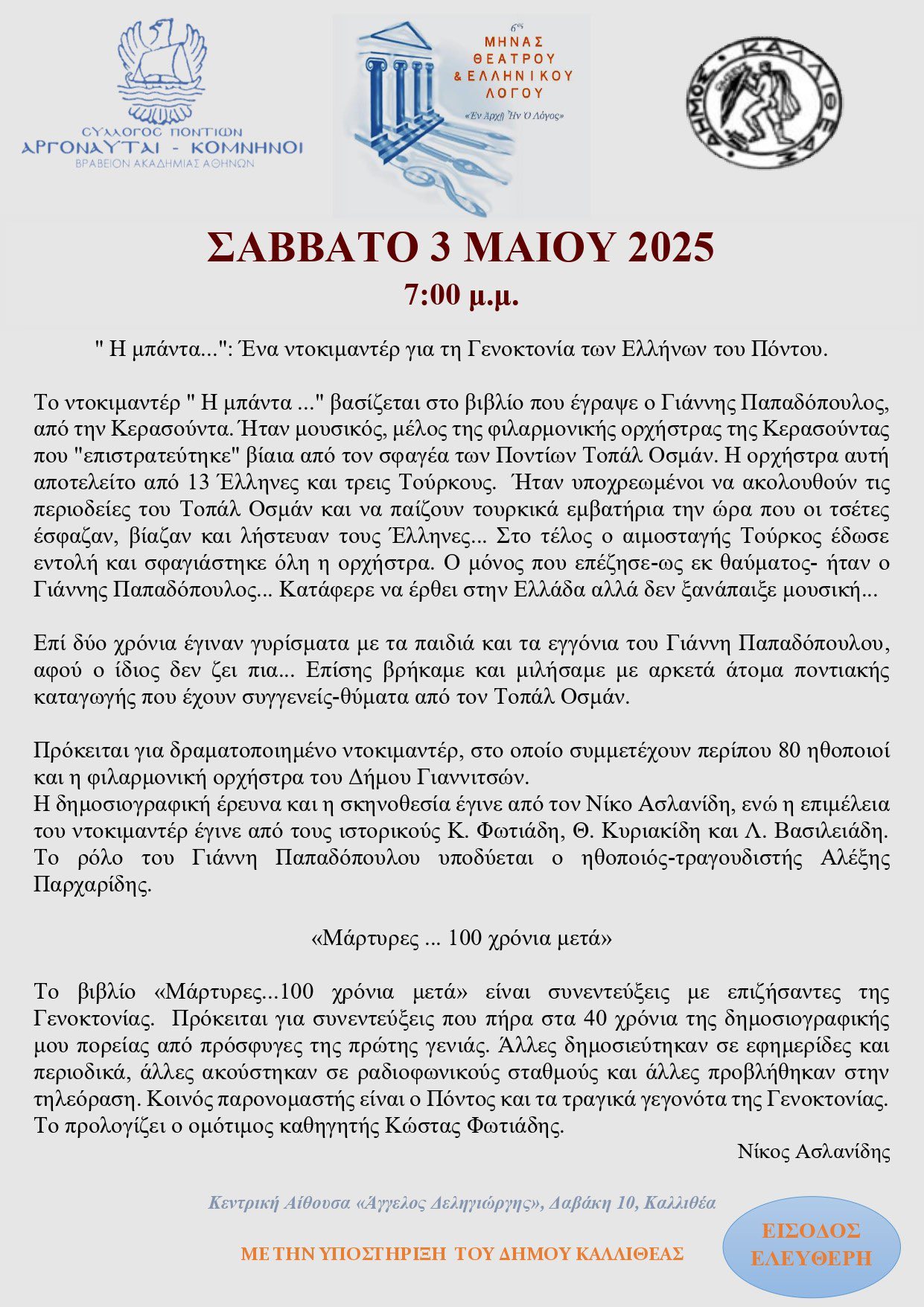 Η προβολή θα λάβει χώρο στις 19.00 το απόγευμα, στον Σύλλογο Ποντίων «Αργοναύται – Κομνηνοί» Καλλιθέας (Δαβάκη 10 Καλλιθέα), ενώ η είσοδος για το κοινό θα είναι δωρεάν.
