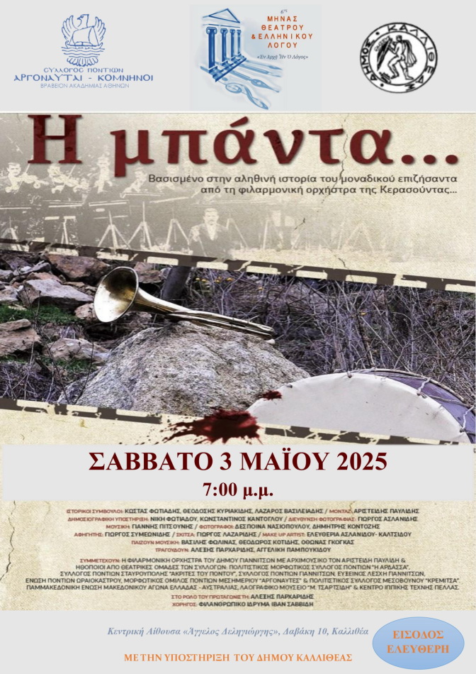 Με αφορμή την Ημέρα μνήμης της Γενοκτονία των Ελλήνων του Πόντου, στις 19 Μαΐου, που φέτος θα τιμηθούν τα 106 χρόνια από τη σφαγή και τον ξεριζωμό των Ελλήνων του Πόντου, θα προβληθεί το Σάββατο 3 Μαΐου 2025 το ντοκιμαντέρ του Νίκου Ασλανίδη «Η μπάντα…».