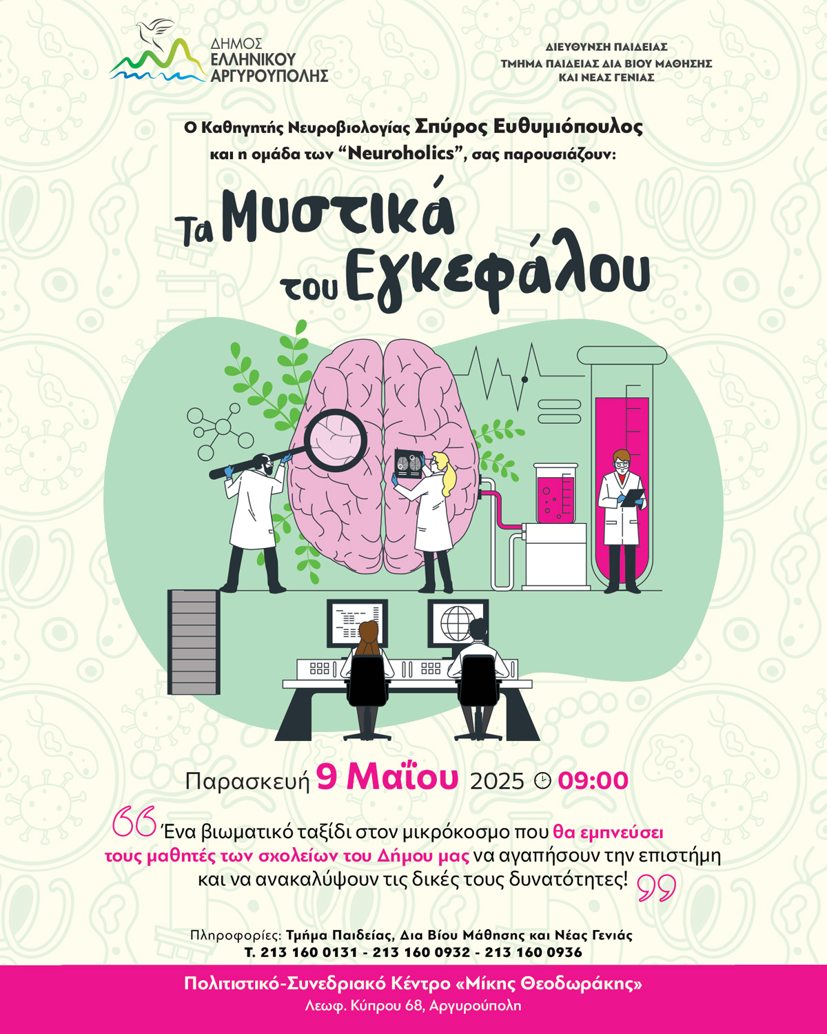 Την Παρασκευή 09 Μαΐου 2025, ώρα 9:00 π.μ., θα λάβει χώρο μια μοναδική επιστημονική παρουσίαση σχετικά με τον κόσμο του εγκεφάλου, από τον Καθηγητή Νευροβιολογίας κ. Σπύρο Ευθυμίου και την ομάδα Neuroholics, στο Πολιτιστικό – Συνεδριακό Κέντρο «Μίκης Θεοδωράκης» (Λεωφ. Κύπρου 68, Αργυρούπολη 164 51).