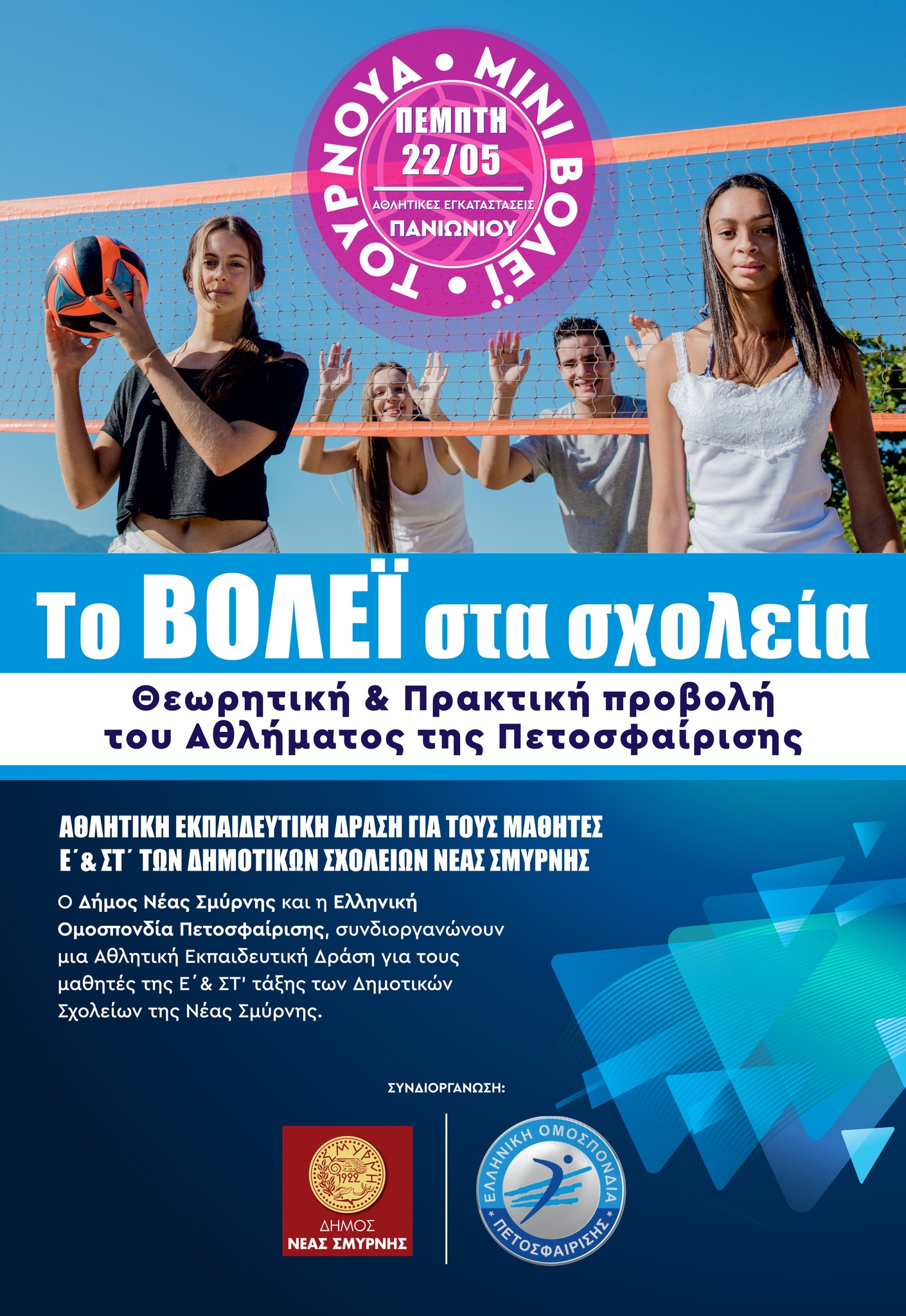 Το πρόγραμμα θα ολοκληρωθεί με τουρνουά «Μίνι Βόλεϊ», στις 22 Μαΐου, στις αθλητικές εγκαταστάσεις του Πανιωνίου Γ.Σ.Σ.