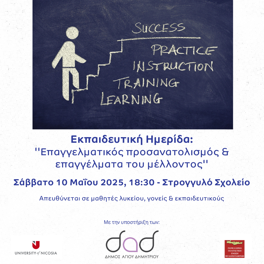 Το Πανεπιστήμιο Λευκωσίας, με την υποστήριξη του Δήμου Αγίου Δημητρίου και της Πανελλήνιας Πολιτιστικής Ένωσης Μυλοποταμιτών, διοργανώνει μία εκπαιδευτική ημερίδα με θέμα: «Επαγγελματικός Προσανατολισμός και Επαγγέλματα του Μέλλοντος».