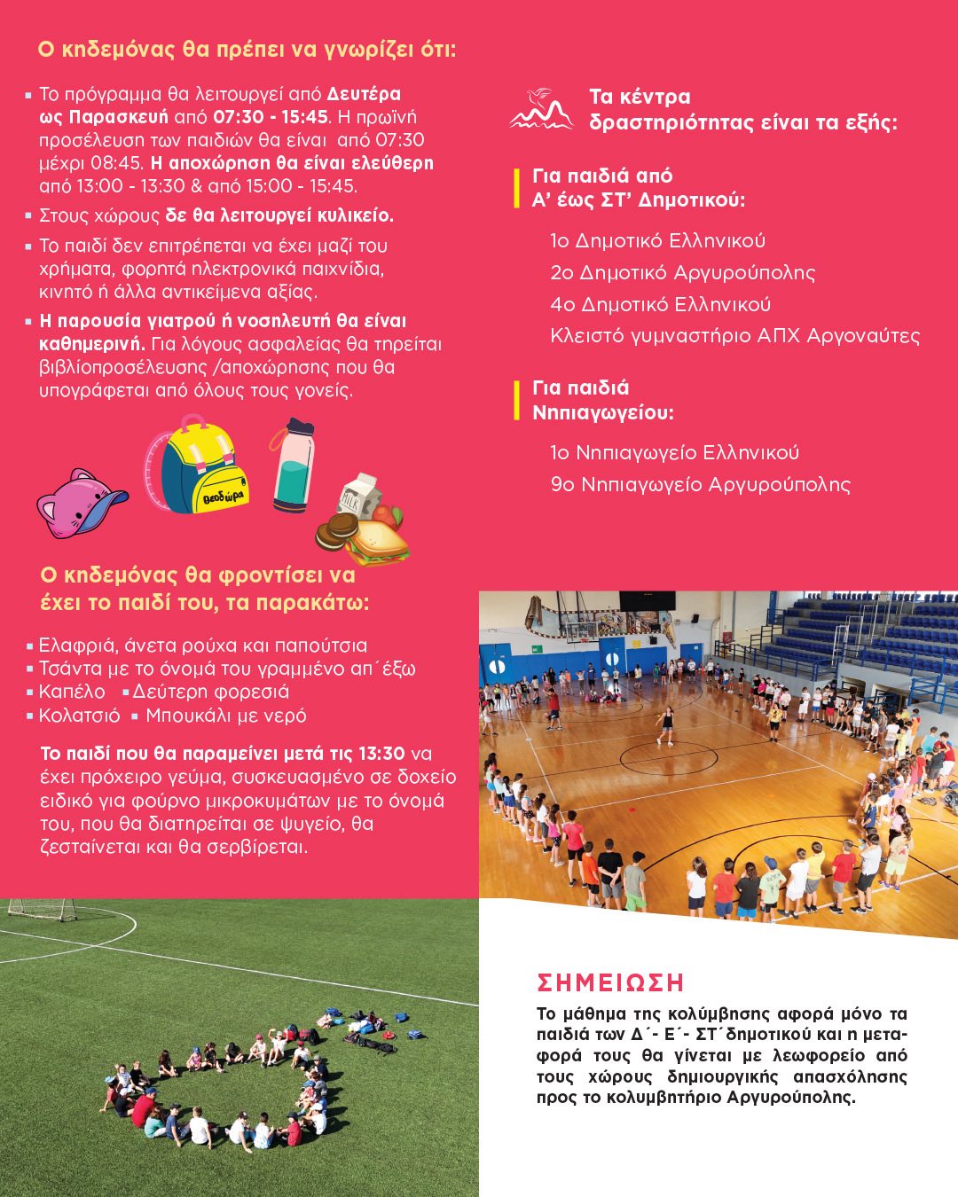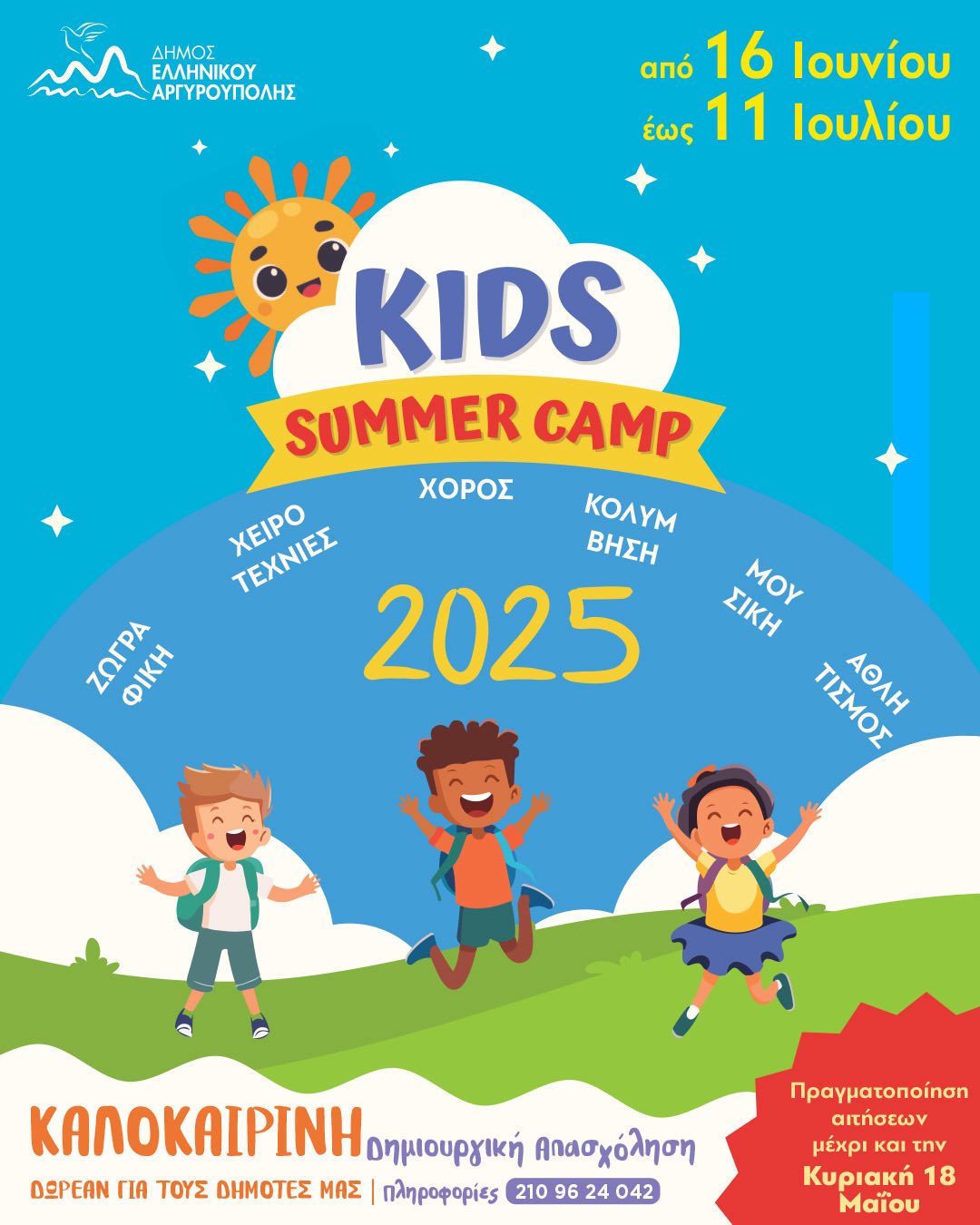 Με πολλές εκπλήξεις και δημιουργικές δράσεις, το «Summer Camp» του Δήμου Ελληνικού – Αργυρούπολης προσφέρει καλοκαιρινές αθλητικές, καλλιτεχνικές και ψυχαγωγικές δραστηριότητες για όλα τα παιδιά του Δήμου που έχουν γεννηθεί από το 2013 μέχρι και το 2019, χωρίς καμία οικονομική επιβάρυνση για τους δημότες.