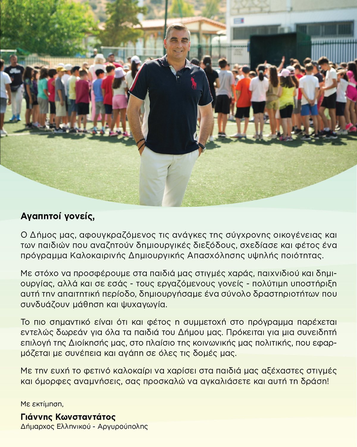 «Ο Δήμος μας, αφουγκραζόμενος τις ανάγκες της σύγχρονης οικογένειας και των παιδιών που αναζητούν δημιουργικές διεξόδους, σχεδίασε και φέτος με πολύ μεράκι ένα πρόγραμμα Καλοκαιρινής Δημιουργικής Απασχόλησης υψηλής ποιότητας. Με στόχο να προσφέρουμε στα παιδιά μας στιγμές χαράς, παιχνιδιού και δημιουργίας , αλλά και σε εσάς – τους εργαζόμενους γονείς – πολύτιμη υποστήριξη αυτή την απαιτητική περίοδο, δημιουργήσαμε ένα σύνολο δραστηριοτήτων που συνδυάζουν μάθηση και ψυχαγωγία» τονίζει ο Δήμαρχος Ελληνικού – Αργυρούπολης Γιάννης Κωνσταντάτος.