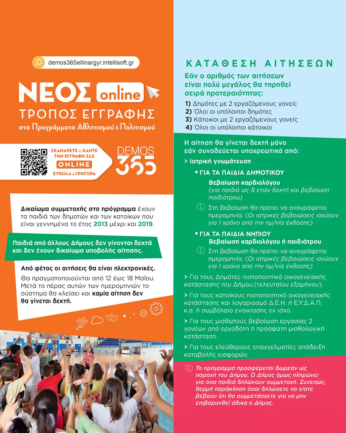 Η περίοδος εγγραφών ξεκινάει από τη Δευτέρα 12 Μαΐου και ολοκληρώνεται την Κυριακή 18 Μαΐου, μέσω της νέας ηλεκτρονικής πλατφόρμας εγγραφών του Δήμου, «Demos365».
