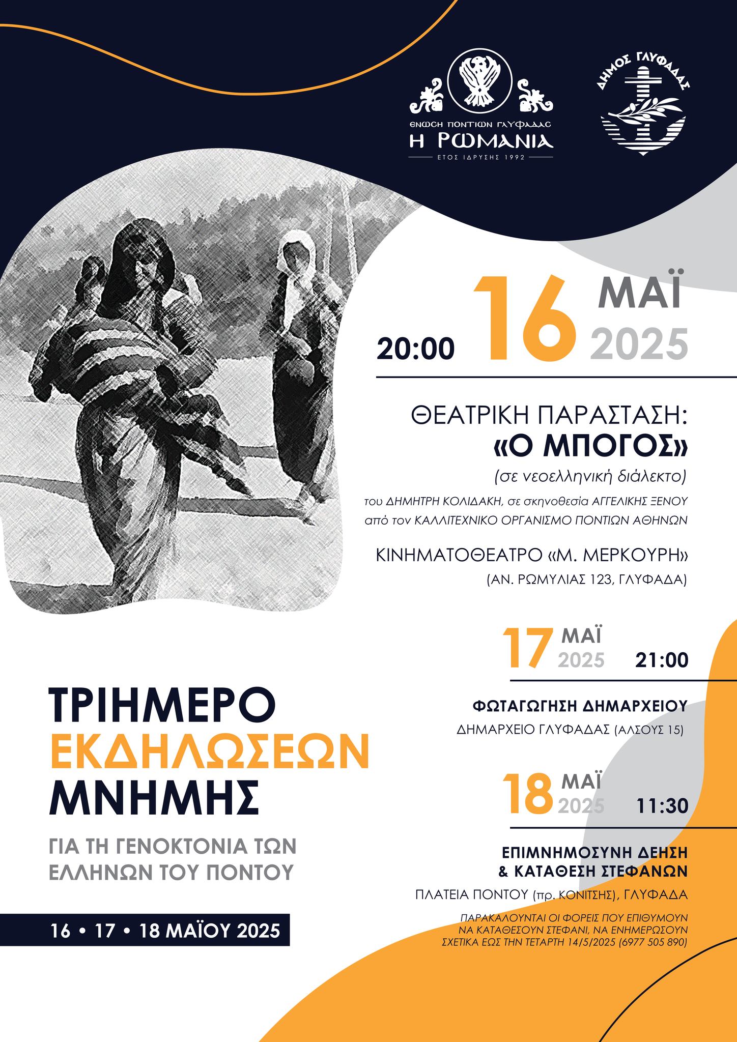 Η Ένωση Ποντίων Γλυφάδας «Η Ρωμανία» έχει προετοιμάσει ένα τριήμερο δράσεων μνήμης και τιμής για τη μαύρη επέτειο της Γενοκτονίας των Ελλήνων του Πόντου, στις 16, 17 και 18 Μαΐου.