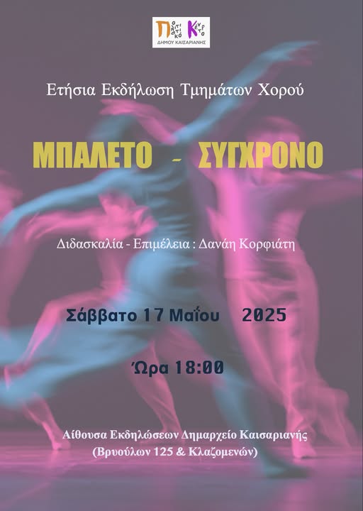 Τα τμήματα Μπαλέτου – Σύγχρονου Χορού και Παραδοσιακών Χορών ετοιμάζουν με πολύ μεράκι δάσκαλοι και μαθητές την ετήσια εκδήλωση τους το Σάββατο 17 Μαΐου 2025 και ώρα 18:00, στην Αίθουσα Εκδηλώσεων Δημαρχείου Καισαριανής (Βρυούλων 125& Κλαζομενών).
