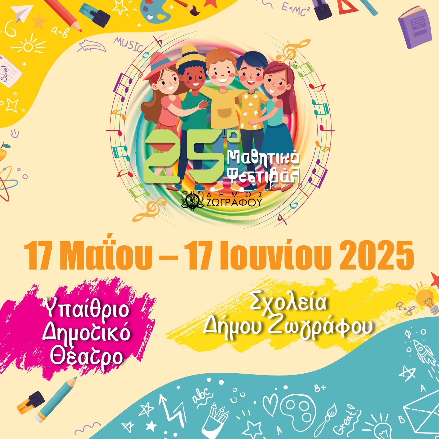 Από τις 17 Μαΐου έως τις 17 Ιουνίου 2025, θα διεξαχθεί στον δήμο Ζωγράφου το 25ο Μαθητικό Φεστιβάλ, στο Υπαίθριο Δημοτικό Θέατρο και στους χώρους των σχολείων του Δήμου.