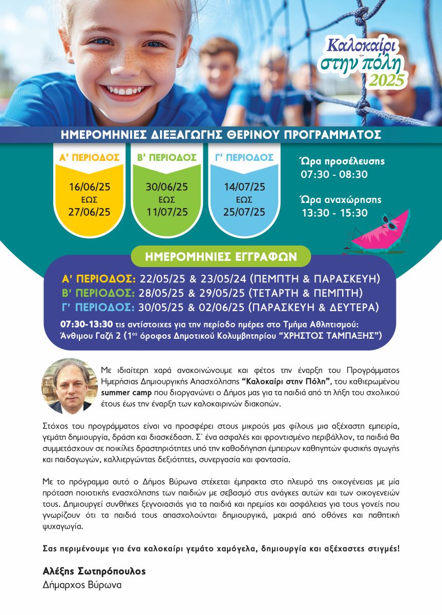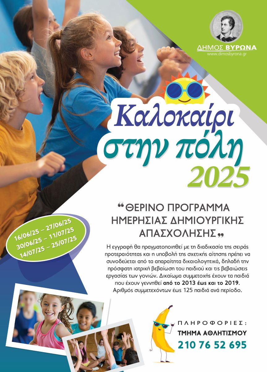 Σε λίγες μέρες ολοκληρώνεται η σχολική χρονιά και ο Δήμος Βύρωνας ετοιμάζει ένα θερινό πρόγραμμα δημιουργικής απασχόλησης για τους μικρούς δημότες, το «Καλοκαίρι στην πόλη 2025».