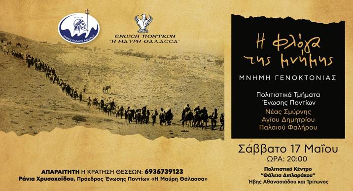 Η Ένωση Ποντίων «Η Μαύρη Θάλασσα», σε συνεργασία με το δήμο Παλαιού Φαλήρου, διοργανώνουν μία εκδήλωση τιμής και μνήμης για τα 106 χρόνια από τη Γενοκτονία των Ελλήνων του Πόντου, με τίτλο «Η Φλόγα της Μνήμης, Μνήμη Γενοκτονίας».