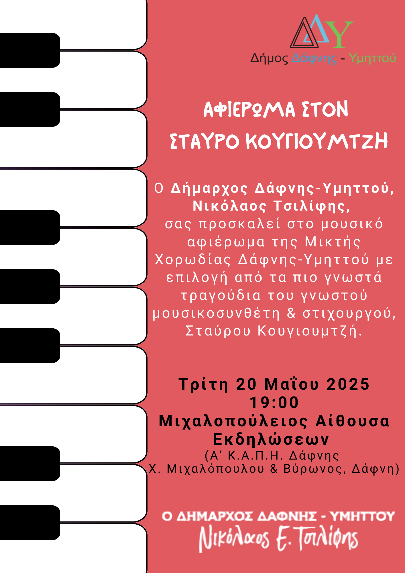Την Τρίτη 20 Μαΐου 2025 και ώρα 19:00, η Μιχαλοπούλειος Αίθουσα Εκδηλώσεων (Α’ Κ.Α.Π.Η. Δάφνης Χ. Μιχαλόπουλου & Βύρωνος, Δάφνη) θα γεμίσει μελωδίες του σπουδαίου καλλιτέχνη Σταύρου Κουγιουμτζη από την η Ορχήστρα της Μικτής Χορωδίας, η οποία αποτελείται από πιάνο, κιθάρα και μπουζούκι.