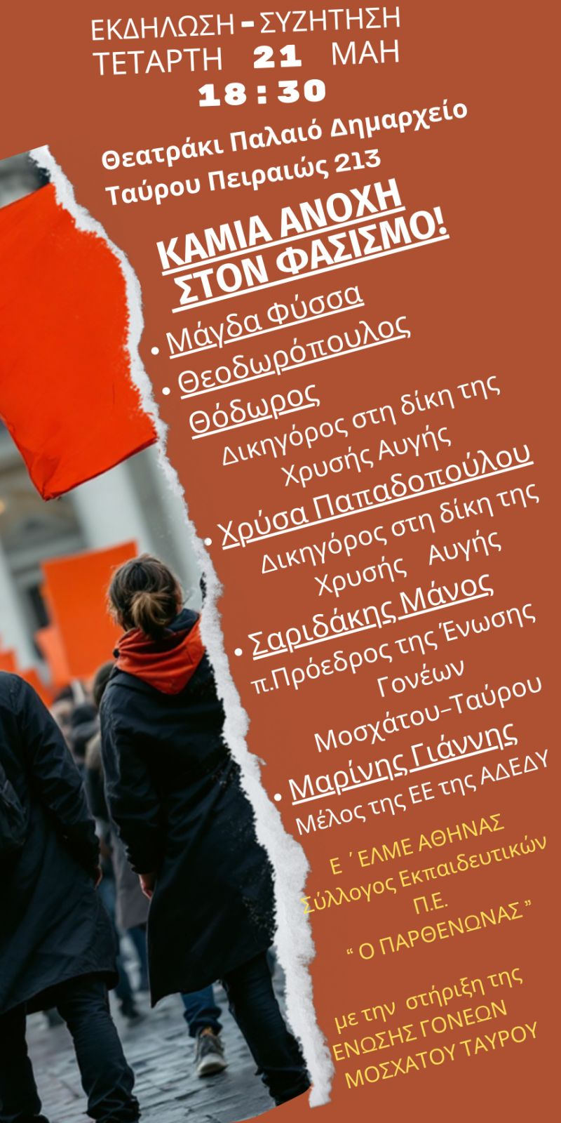 Θα μιλήσουν οι: Μάγδα Φύσσα, ο Θόδωρος Θεοδωρόπουλος και η Χρύσα Παπαδοπούλου, δικηγόροι Πολιτικής Αγωγής στη δίκη της Χρυσής Αυγής, ο Μάνος Σαριδάκης, τ. πρόεδρος της Ένωσης Γονέων Μοσχάτου – Ταύρου και ο Γιάννης Μαρίνης, εκπαιδευτικός, μέλος της ΕΕ της ΑΔΕΔΥ.