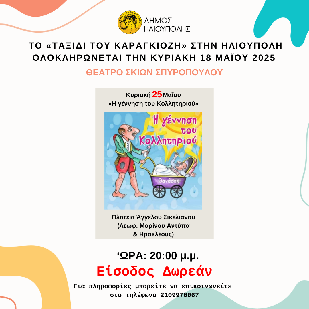 Η τελευταία στάση του Καραγκιόζη θα είναι στην Πλατεία Άγγελου Σικελιανού, την Κυριακή 25 Μαΐου 2025 στις 20:00 μ.μ. (Λεωφόρος Μαρίνου Αντύπα & Ηρακλέους).