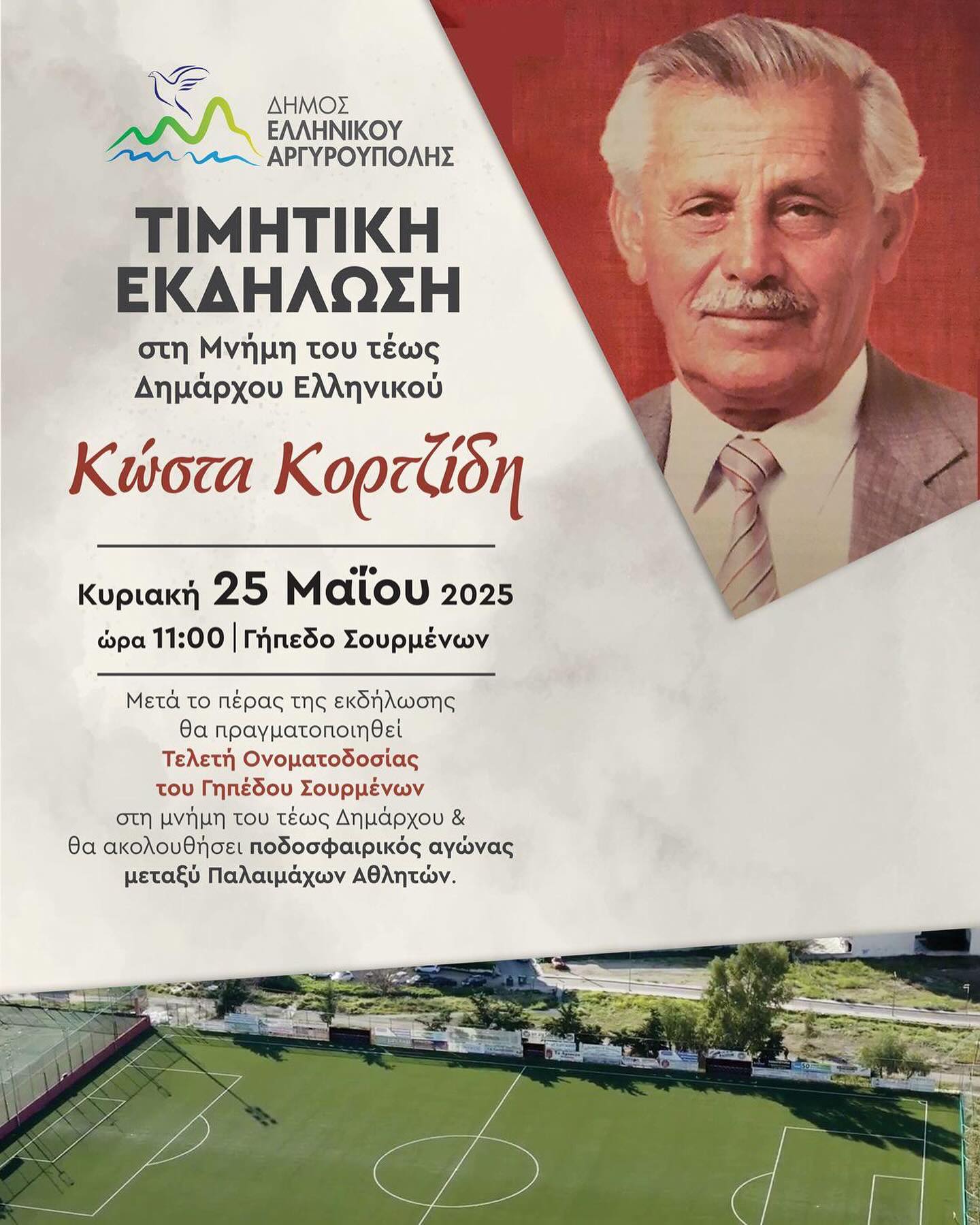 Σε μια ξεχωριστή τιμητική εκδήλωση, αφιερωμένη στη μνήμη του τέως Δημάρχου του Ελληνικού Κώστα Κορτζίδη, θα πραγματοποιηθεί η τελετή ονοματοδοσίας του Γηπέδου Σουρμένων την Κυριακή 25 Μαΐου και ώρα 11:00 π.μ..