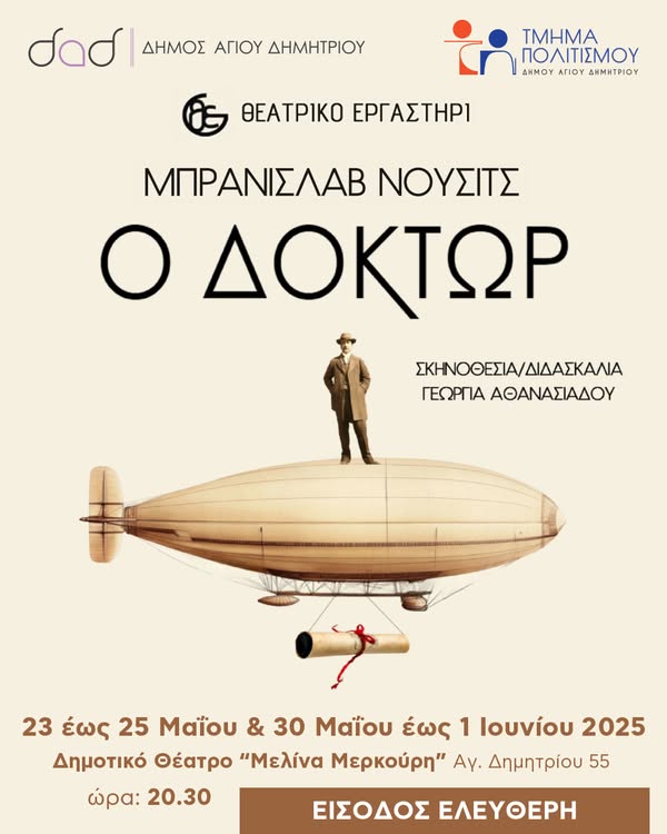 Το Θεατρικό Εργαστήρι του Δήμου Αγίου Δημητρίου παρουσιάζει στο Δημοτικό Θέατρο «Μελίνα Μερκούρη», το έργο «Ο Δόκτωρ» του Μπράνισλαβ Νούσιτς, με ελεύθερη είσοδο για το κοινό!