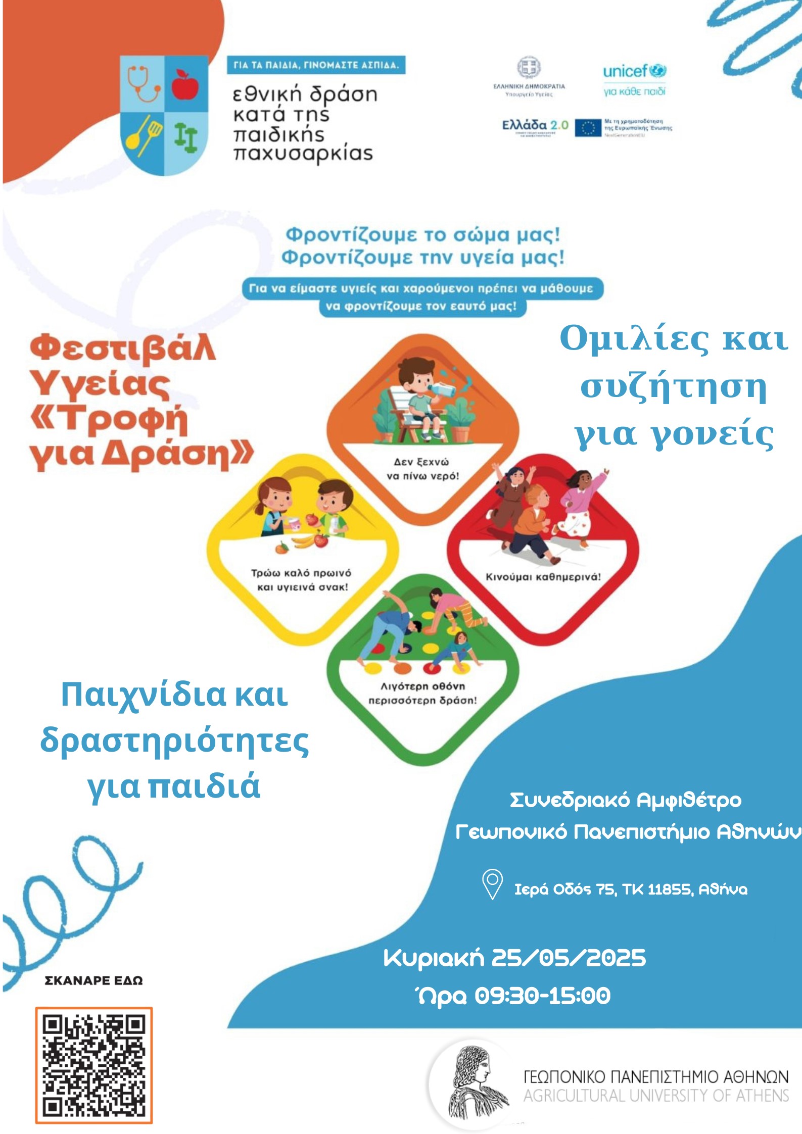 Στο πλαίσιο της Εθνικής Δράσης για την Αντιμετώπιση της Παιδικής Παχυσαρκίας, που υλοποιείται από το Υπουργείο Υγείας σε συνεργασία με τη UNICEF, διοργανώνεται ένα φεστιβάλ υγείας για παιδιά και οικογένειες, που θα πραγματοποιηθεί την Κυριακή 25 Μαΐου, από τις 9:30 π.μ. έως 3:00 μ.μ., στο Γεωπονικό Πανεπιστήμιο Αθηνών.