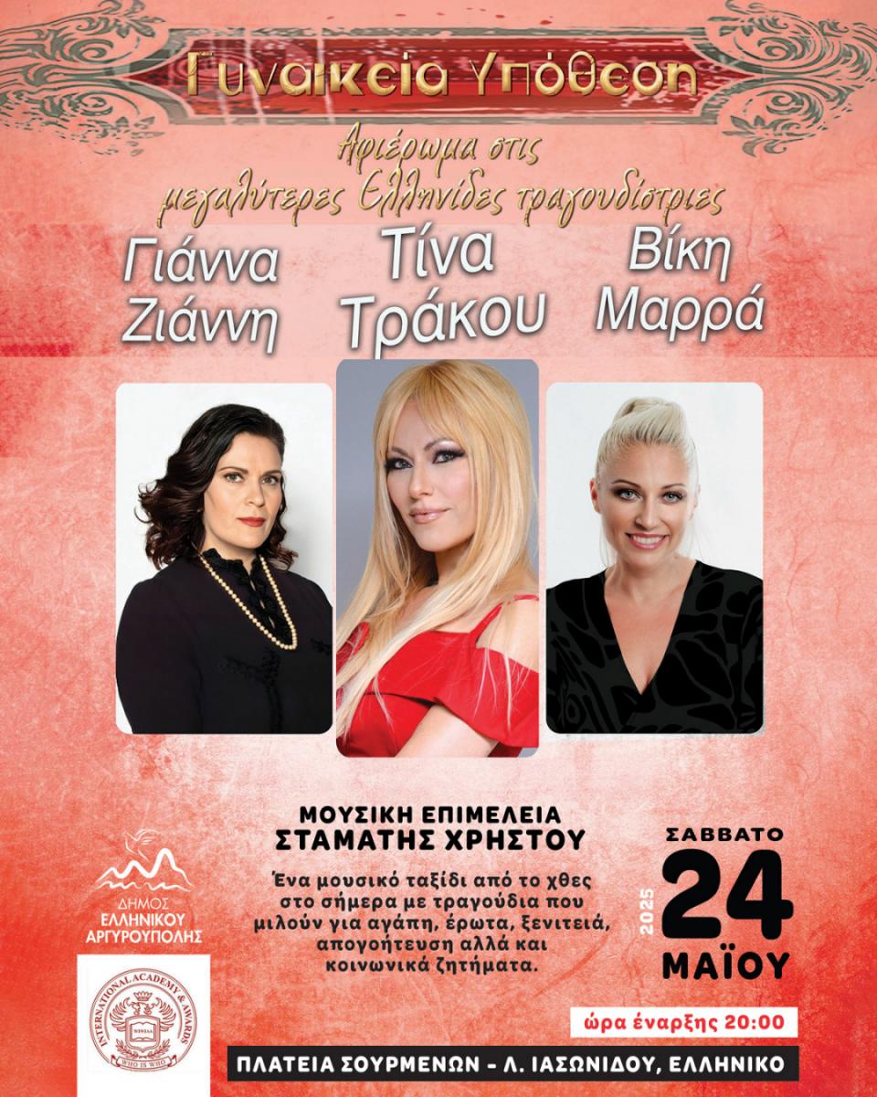 Στο πλαίσιο των εκδηλώσεων της Έκθεσης Βιβλίου 2025, ο Δήμος Ελληνικού – Αργυρούπολης προσκαλεί το κοινό σε μια ξεχωριστή μουσική βραδιά με τίτλο «Γυναικεία Υπόθεση», ένα αφιέρωμα στις σημαντικότερες Ελληνίδες τραγουδίστριες που άφησαν ανεξίτηλο αποτύπωμα στην ιστορία του ελληνικού πενταγράμμου.
