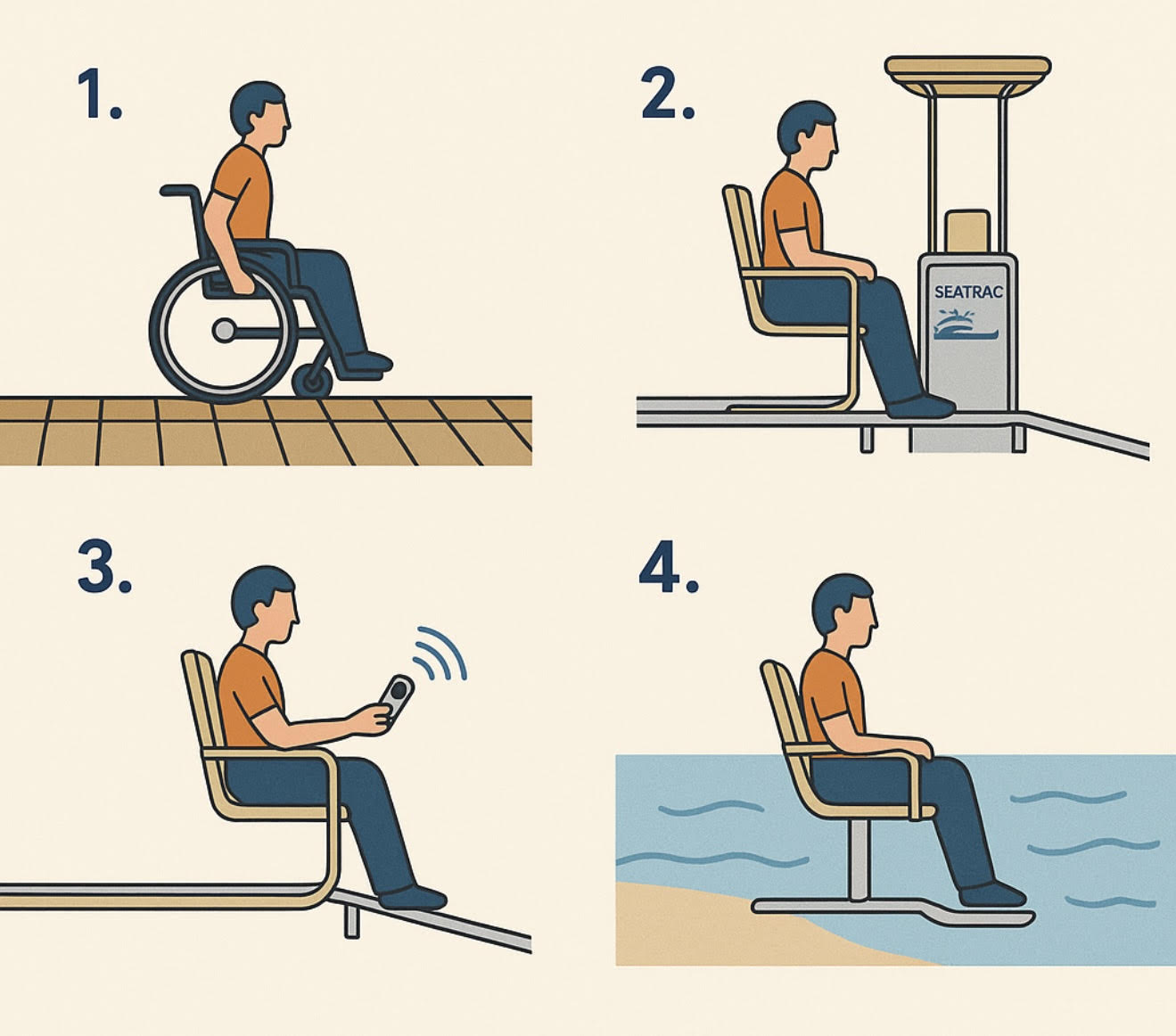 Από εκεί κάθεται στο κάθισμα του SEATRAC, που είναι τοποθετημένο στο ίδιο ύψος με το αμαξίδιο, επιτρέποντας την εύκολη μετακίνηση από το αμαξίδιο στο κάθισμα, είτε αυτόνομα είτε με ελαφριά βοήθεια (ανάλογα με την κινητικότητα του χρήστη). Υπάρχουν πλαϊνά στηρίγματα για επιπλέον σταθερότητα και ασφάλεια. Αφού καθίσει, με το κουμπί ενεργοποίησης ξεκινά η ήπια κάθοδος του καθίσματος μέσα στο νερό, επιτρέποντάς του να απολαύσει το μπάνιο του αυτόνομα.