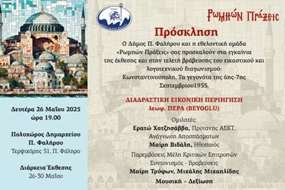 Με αφορμή την επέτειο Άλωσης της Κωνσταντινούπολης (29 Μαΐου 1453), η εθελοντική ομάδα «Ρωμηών Πράξεις» διοργανώνει τα εγκαίνια της έκθεσης και την τελετή βράβευσης του εικαστικού και λογοτεχνικού διαγωνισμού: «Κωνσταντινούπολη. Τα γεγονότα της 6ης-7ης Σεπτεμβρίου 1955».