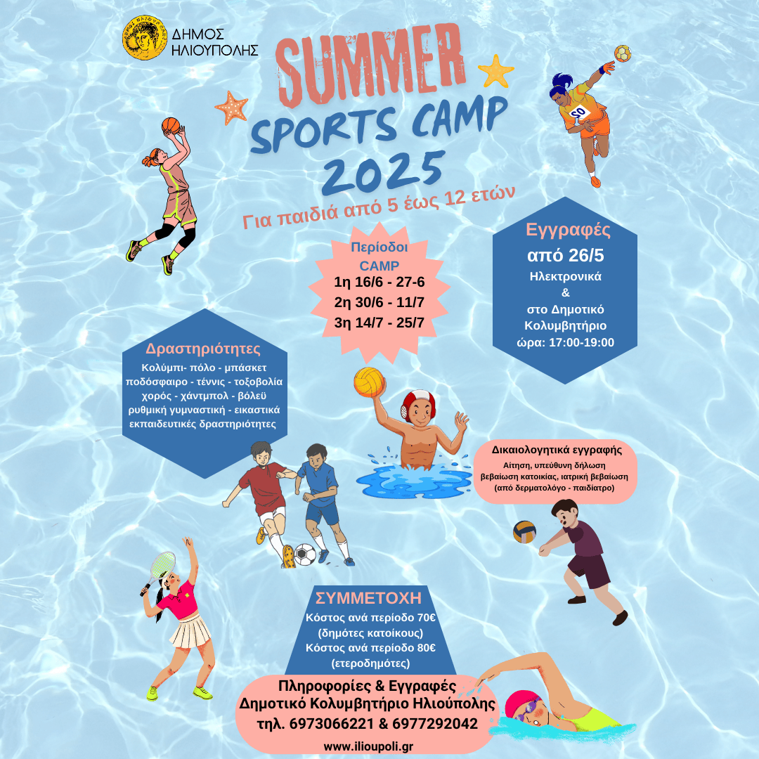 Το Summer Sports Camp «Καλοκαίρι 2025» έρχεται για δεύτερη συνεχόμενη χρονιά στον Δήμο Ηλιούπολης, προσφέροντας στους μικρούς δημότες μια ποιοτική, δημιουργική και ευχάριστη αξιοποίηση του ελεύθερου χρόνου τους, θέλοντας παράλληλα να στηρίξει τους εργαζόμενους γονείς.