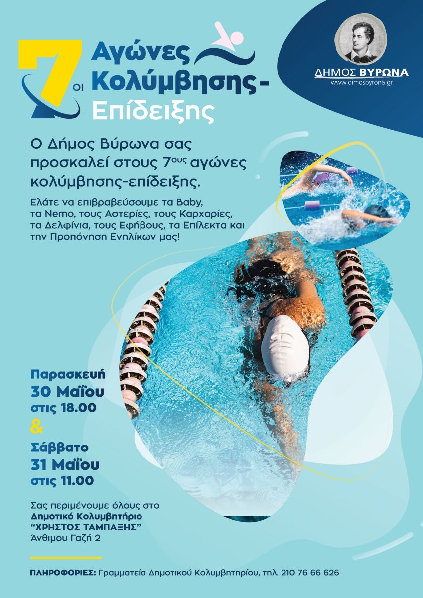 Για έβδομη χρονιά, ο Δήμος Βύρωνας διοργανώνει τους ετήσιους αγώνες κολύμβησης – επίδειξης, στο Δημοτικό Κολυμβητήριο «Χρήστος Ταμπαξής» (Ανθίμου Γαζή, Βύρωνας 162 31).