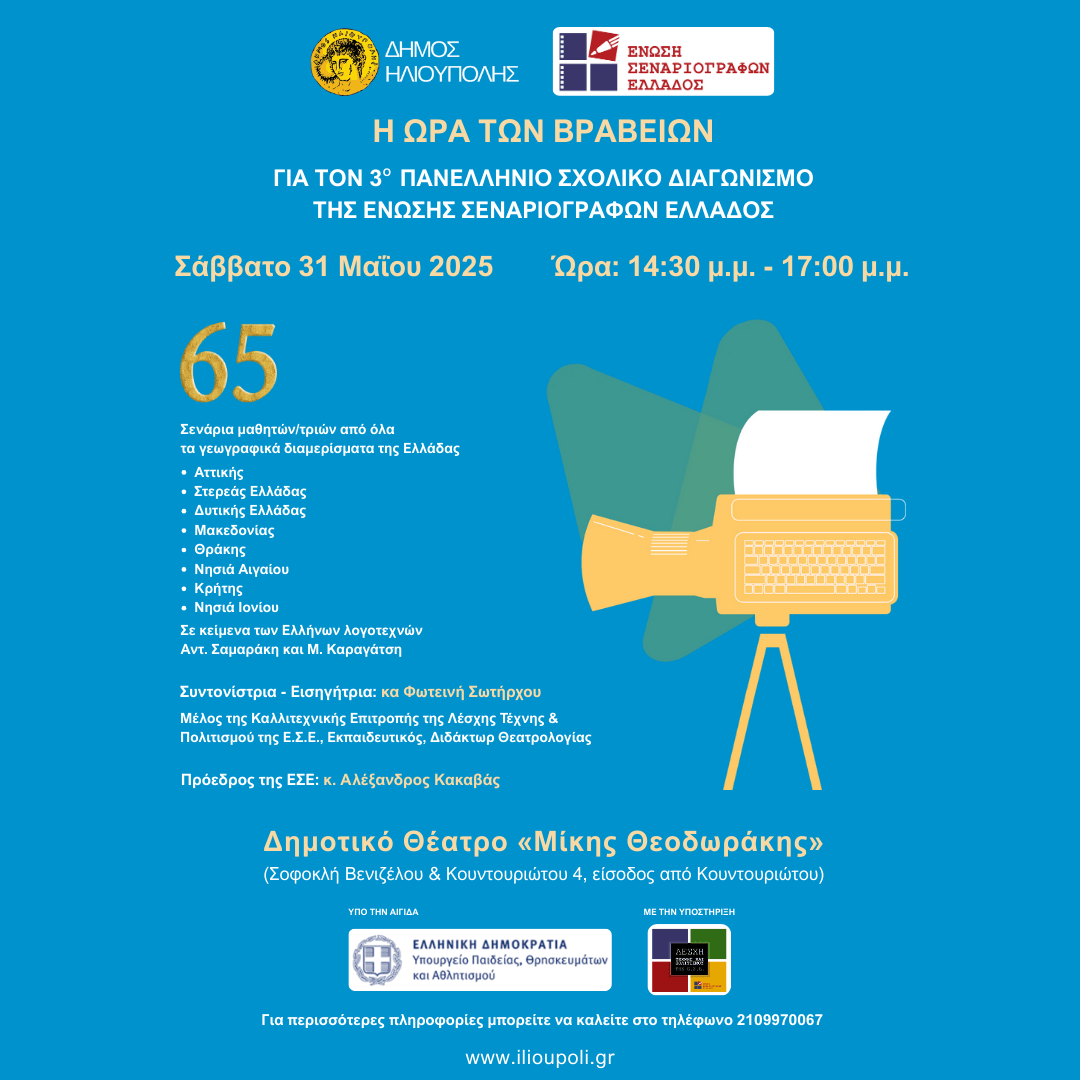 Το Σάββατο 31 Μάϊου 2025 και ώρα 14:30 μ.μ. – 17:00 μ.μ., στο Δημοτικό Θέατρο Ηλιούπολης «Μίκης Θεοδωράκης» θα λάβει χώρο η τελετή απονομής των βραβείων στους διακριθέντες του 3ου Πανελληνίου Σχολικού Διαγωνισμού Συγγραφής Σεναρίου εκ Διασκευής Ελληνικού Διηγήματος.