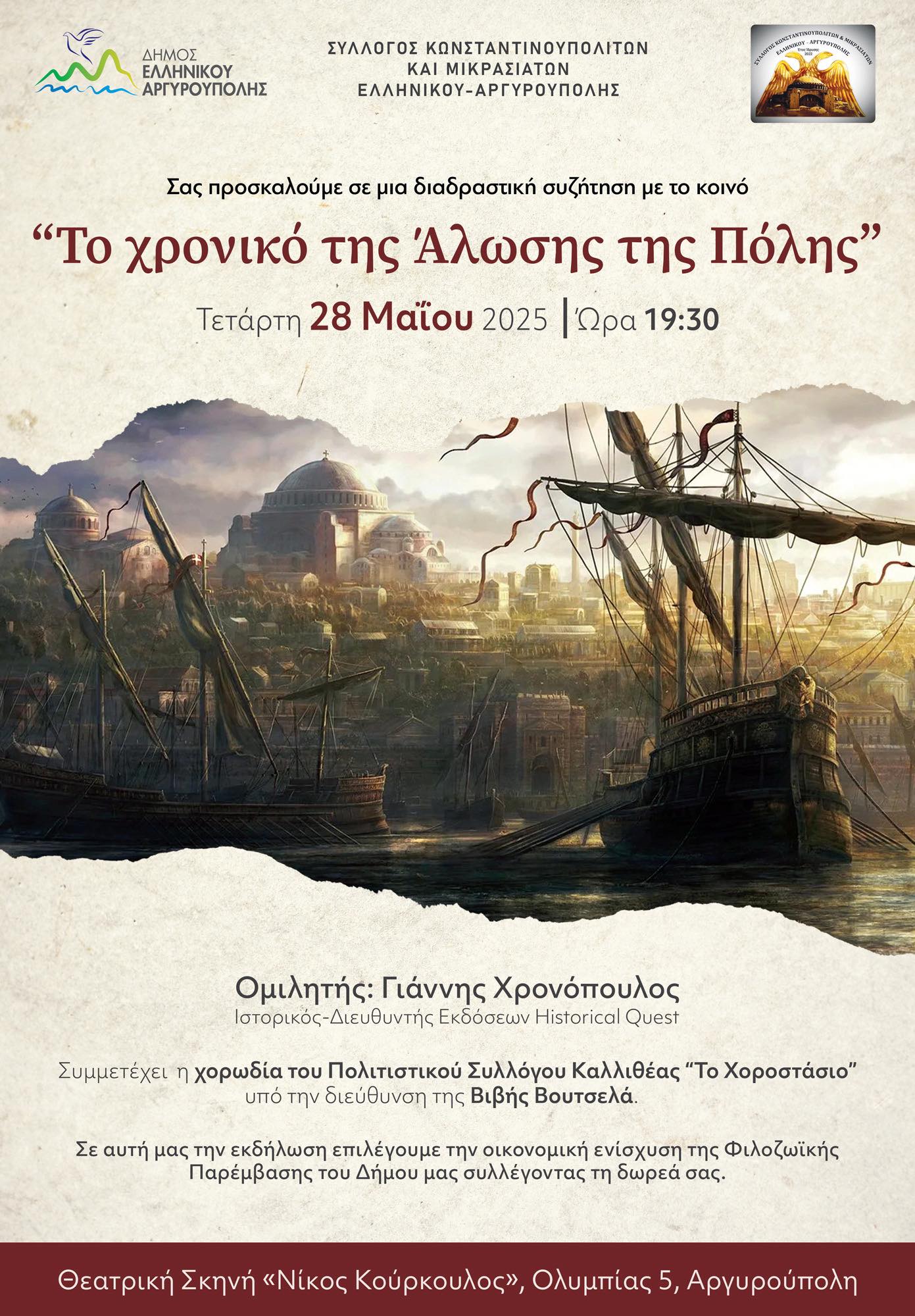 Ο Σύλλογος Κωνσταντινουπολιτών και Μικρασιατών Ελληνικού-Αργυρούπολης, σε συνεργασία με τον Δήμο Ελληνικού-Αργυρούπολης διοργανώνουν μια ξεχωριστή εκδήλωση μνήμης, με τίτλο «Το χρονικό της Άλωσης της Πόλης».