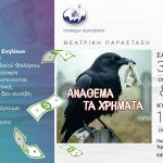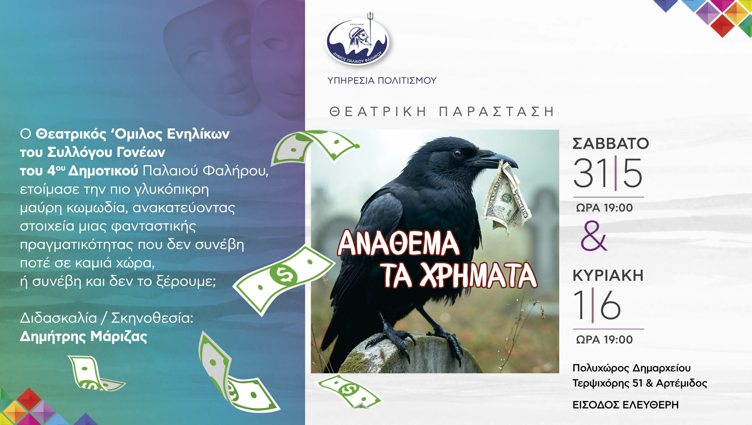 Η θεατρική παράσταση «Ανάθεμα τα Χρήματα», σε σκηνοθεσία του Δημήτρη Μαρίζα, θα πραγματοποιήσει δύο παραστάσεις, το Σάββατο 31 Μαΐου και την Κυριακή 1 Ιουνίου, στις 19.00, στον Πολυχώρο του Δημαρχείου (Τερψιχόρης 51 & Αρτέμιδος).