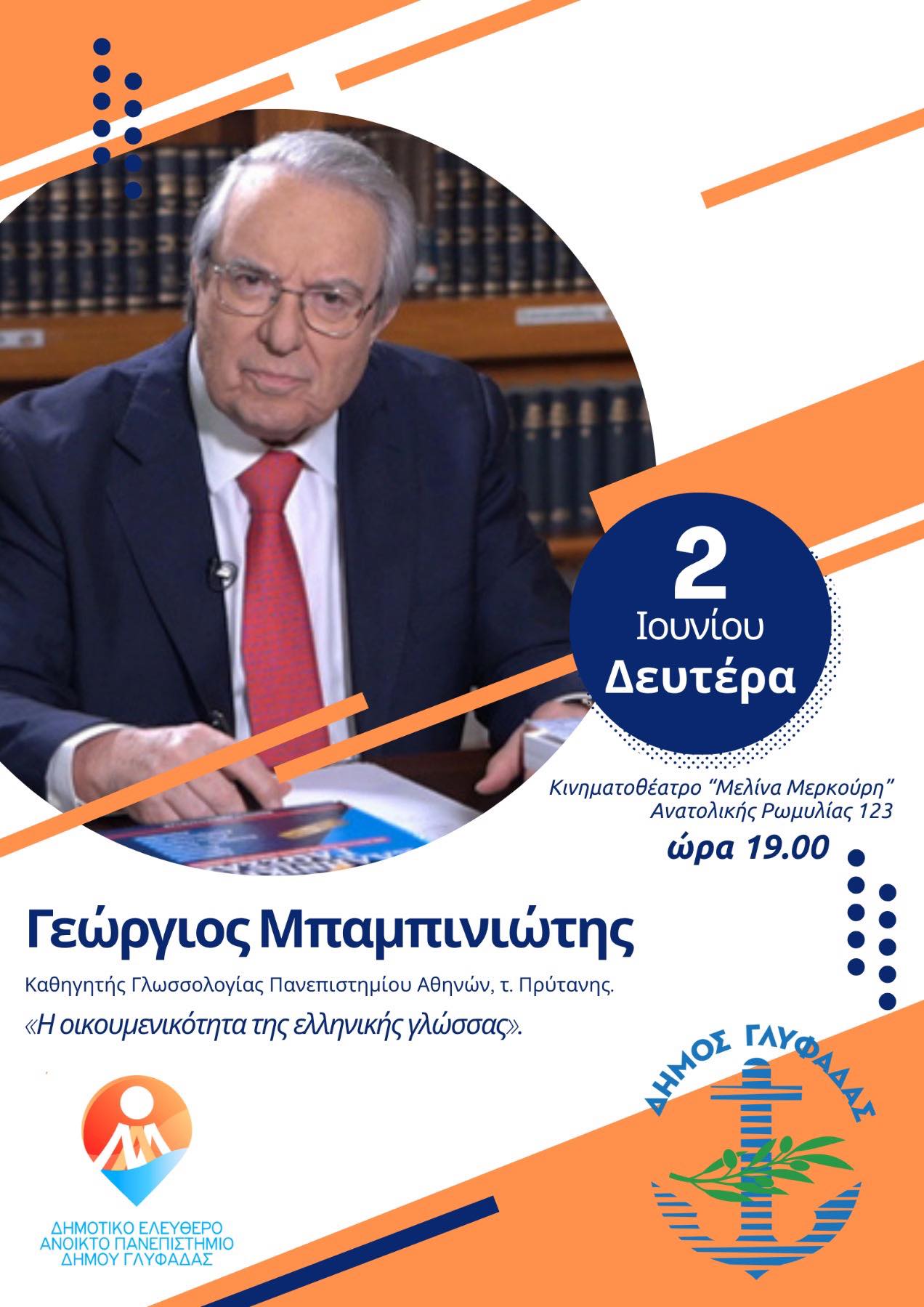 Το Δημοτικό Ελεύθερο Ανοικτό Πανεπιστήμιο (ΔΕΑΠ) του Δήμου Γλυφάδας, ολοκληρώνει τον φετινό εαρινό κύκλο διαλέξεων του, με μία μοναδική διάλεξη με ομιλητή τον κύριο Γεώργιο Μπαμπινιώτη, Καθηγητή Γλωσσολογίας Πανεπιστημίου Αθηνών, τ. Πρύτανης, με θέμα «Η οικουμενικότητα της ελληνικής γλώσσας».
