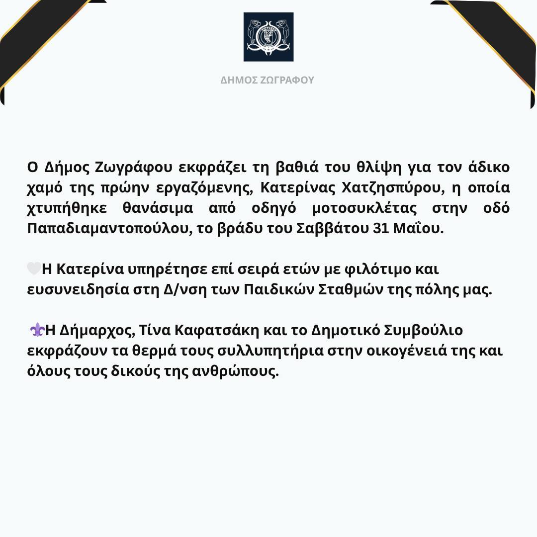 Ο Δήμος Ζωγράφου εκφράζει τη βαθιά του θλίψη για τον άδικο χαμό της πρώην εργαζόμενης, Κατερίνας Χατζησπύρου, η οποία χτυπήθηκε θανάσιμα από οδηγό μοτοσυκλέτας στην οδό Παπαδιαμαντοπούλου, το βράδυ του Σαββάτου 31 Μαΐου.