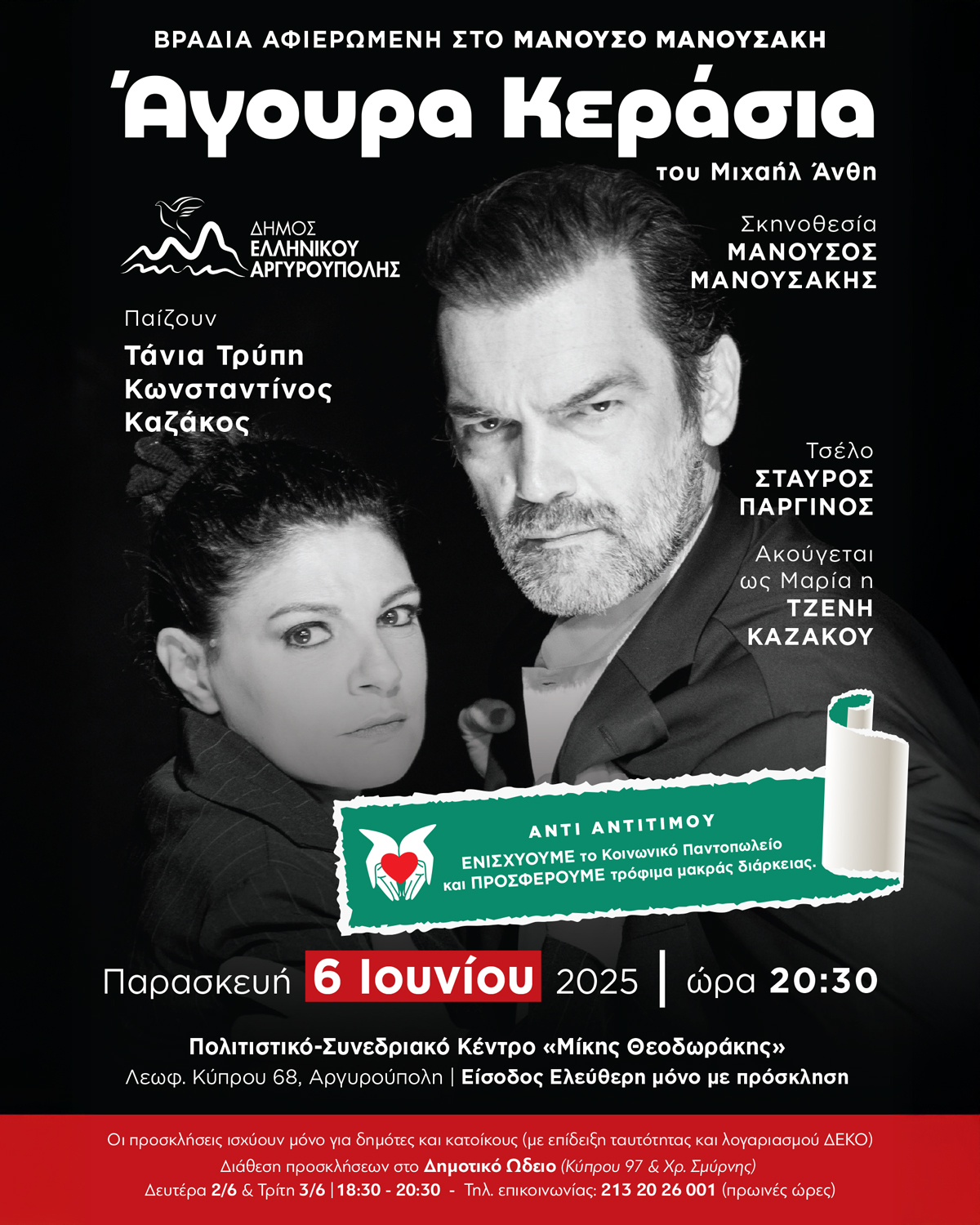 Ο Δήμος Ελληνικού – Αργυρούπολης τιμά τη μνήμη του σπουδαίου σκηνοθέτη Μανούσου Μανουσάκη, φιλοξενώντας την τελευταία θεατρική του σκηνοθεσία, με το συγκλονιστικό έργο «Άγουρα Κεράσια» του Μιχαήλ Άνθη.