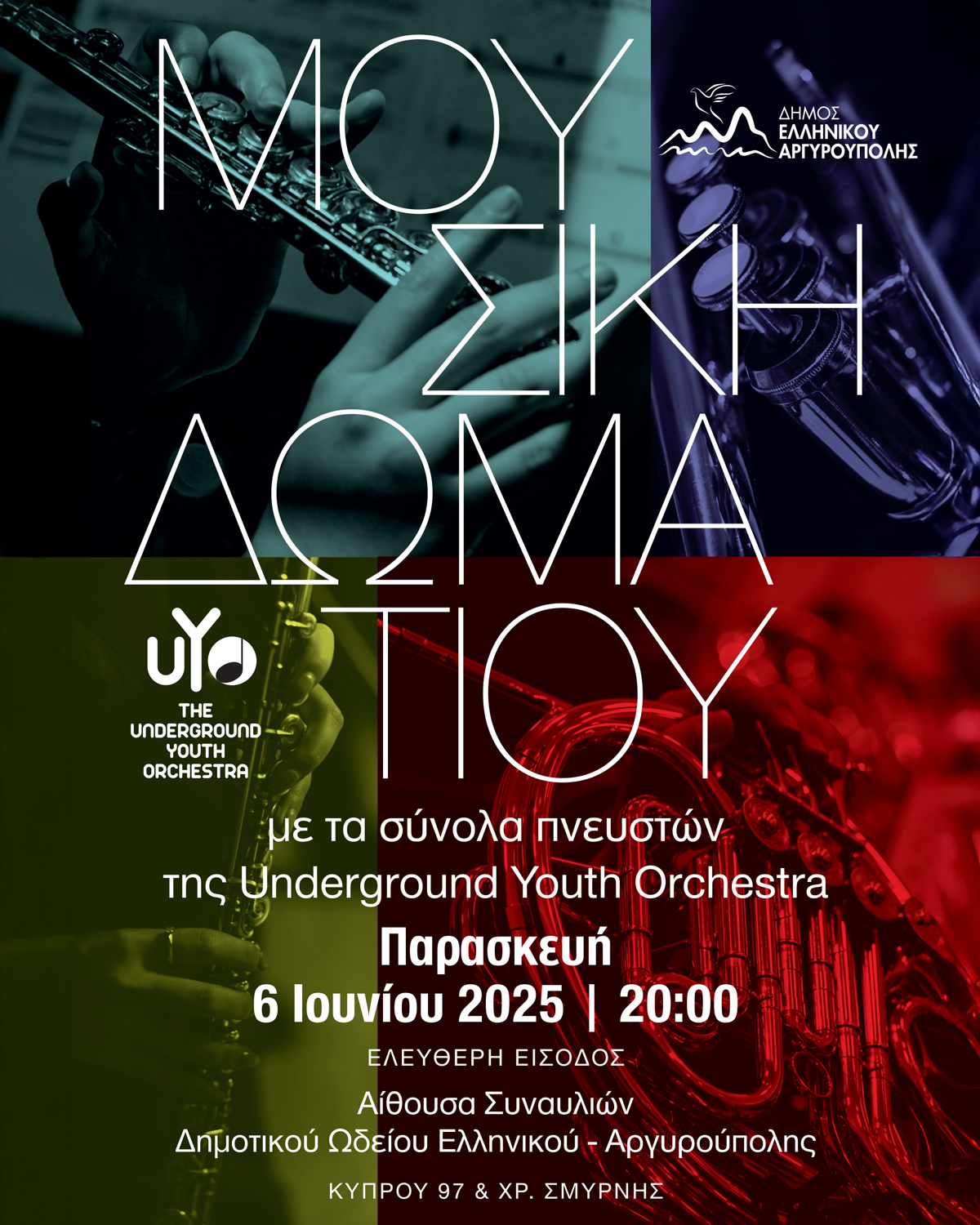 Συγκεκριμένα, ο Δήμος και το Δημοτικό Ωδείο Ελληνικού – Αργυρούπολης, υποδέχονται τα Σύνολα Πνευστών της Underground Youth Orchestra σε μια ξεχωριστή Συναυλία Μουσικής Δωματίου, την Παρασκευή 6 Ιουνίου και ώρα 20:00, στην Αίθουσα Συναυλιών του Ωδείου (Κύπρου 97, Αργυρούπολη).