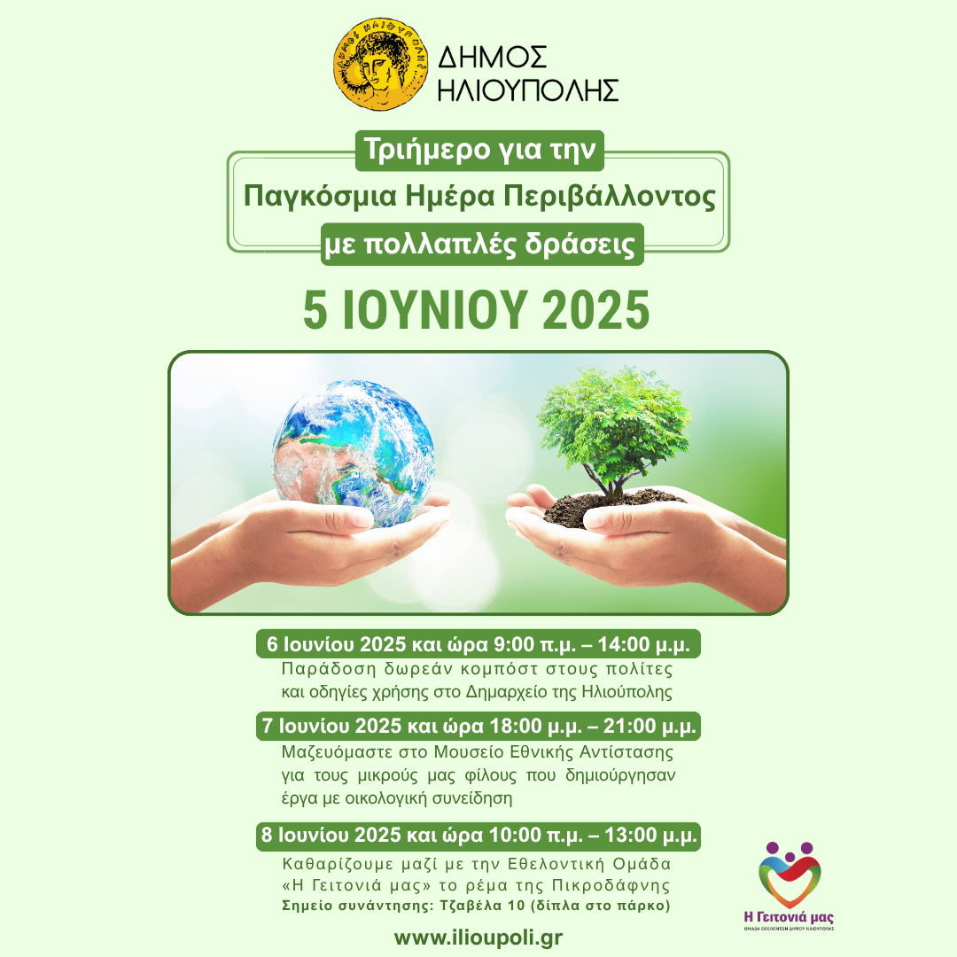 Την Παγκόσμια Ημέρα Περιβάλλοντος τιμά ο Δήμος Ηλιούπολης στις 5 Ιουνίου 2025 με πολλαπλές δράσεις που θα διαρκέσουν το τριήμερο, από τις 6 έως τις 8 Ιουνίου 2025, με στόχο την ευαισθητοποίηση των δημοτών και κατοίκων και την προώθηση των αρχών της Βιώσιμης Ανάπτυξης και Αειφορίας.