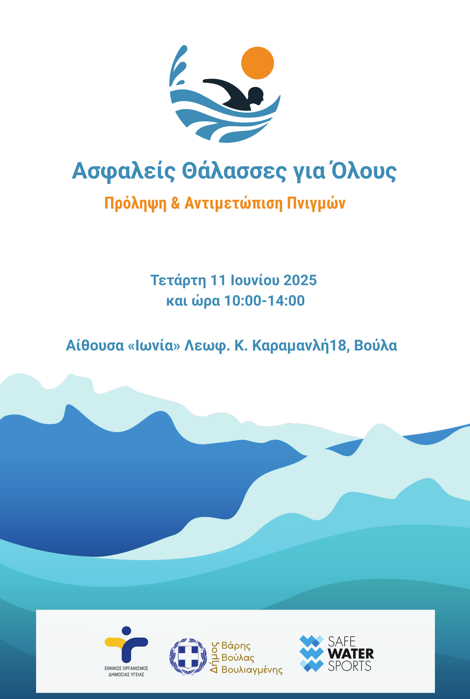 Μία ιδιαίτερα σημαντική ενημερωτική εκδήλωση για την πρόληψη και αντιμετώπιση των πνιγμών διοργανώνουν ο Δήμος Βάρης Βούλας Βουλιαγμένης, ο Εθνικός Οργανισμό Δημόσιας Υγείας και η οργάνωση Safe Water Sports, την Τετάρτη 11 Ιουνίου στις 10:00 π.μ., στο πολιτιστικό κέντρο «Ιωνία» (Λεωφ. Κ. Καραμανλή 18, Βούλα).