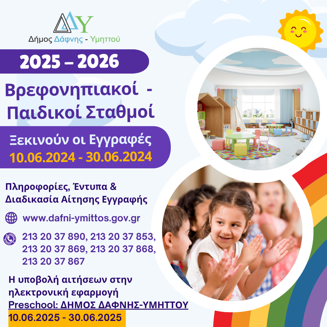 Ο Δήμος Δάφνης – Υμηττού ανακοινώνει την έναρξη των εγγραφών βρεφών και νηπίων στους Παιδικούς και Βρεφονηπιακούς Σταθμούς, του δήμου, για το σχολικό έτος 2025 – 2026.