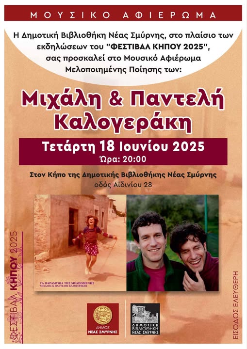 Το «Φεστιβάλ Κήπου» της Δημοτικής Βιβλιοθήκης του Δήμου Νέας Σμύρνης, που τόσο πολύ αγαπήθηκε από τους πολίτες και τους καλλιτέχνες, ρίχνει την αυλαία του με μία βραδιά μελοποιημένης ποίησης με τίτλο «Τα παραμύθια της Μελπομένης».