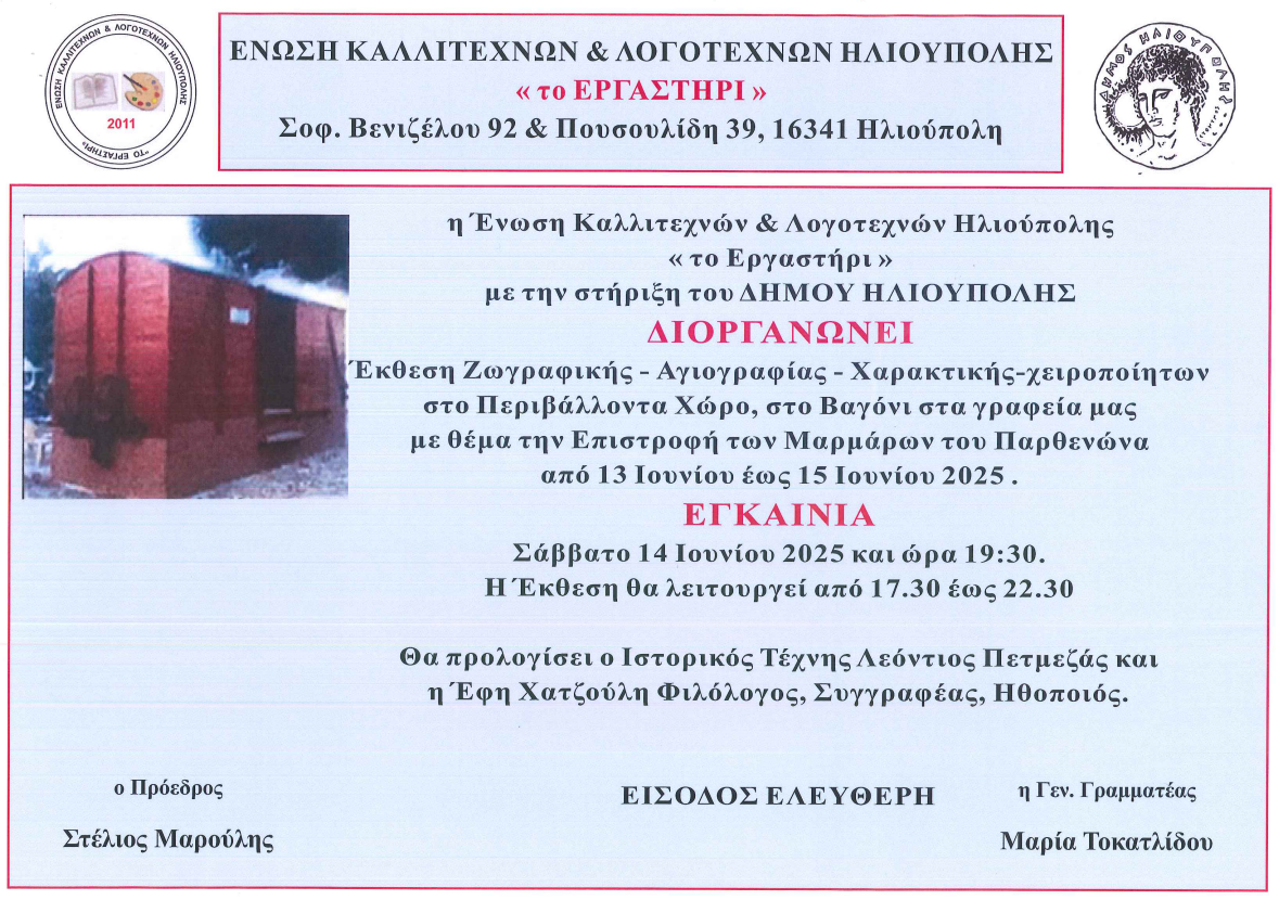 Η Ένωση Καλλιτεχνών & Λογοτεχνών Ηλιούπολης «Το Εργαστήρι», με την υποστήριξη του Δήμου Ηλιούπολης, διοργανώνει μία ιδιαίτερα ενδιαφέρουσα έκθεση Ζωγραφικής, Αγιογραφίας, Χαρακτικής και Χειροποίητων με θέμα «Επιστροφή των Μαρμάρων του Παρθενώνα».