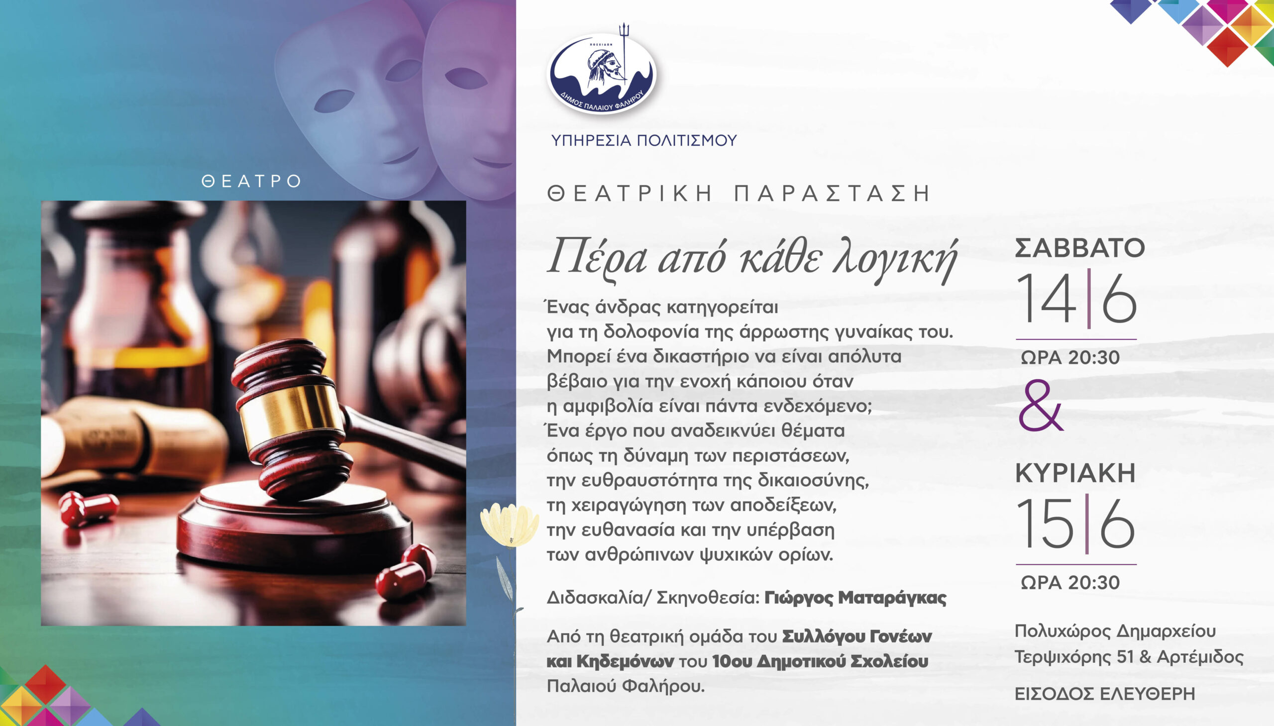 Η παράσταση θα λάβει χώρο το Σάββατο 14 και τη Κυριακή 15 Ιουνίου και ώρα 20:30, στον Πολυχώρο του Δημαρχείου Παλαιού Φαλήρου (Τερψιχόρης 51 & Αρτέμιδος).